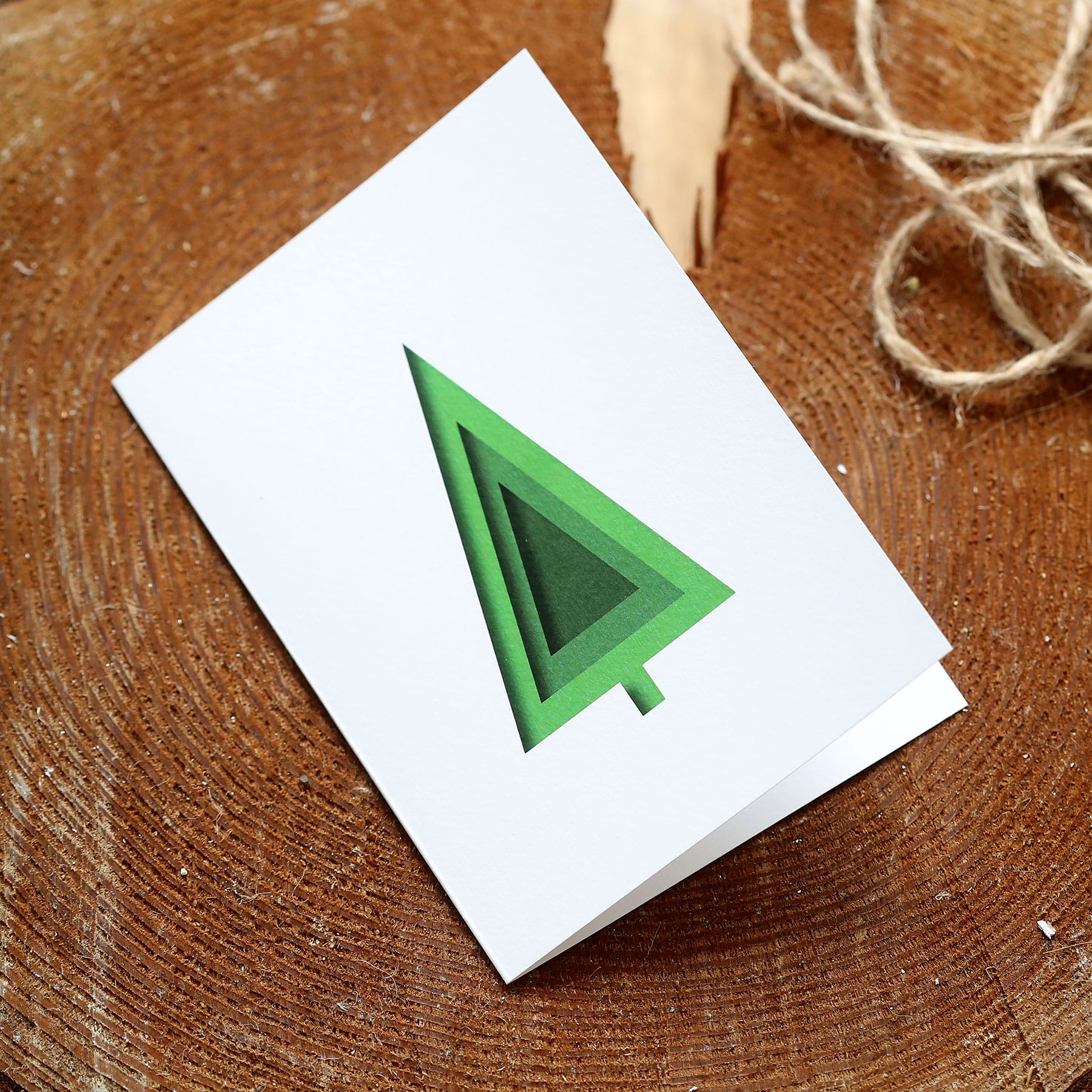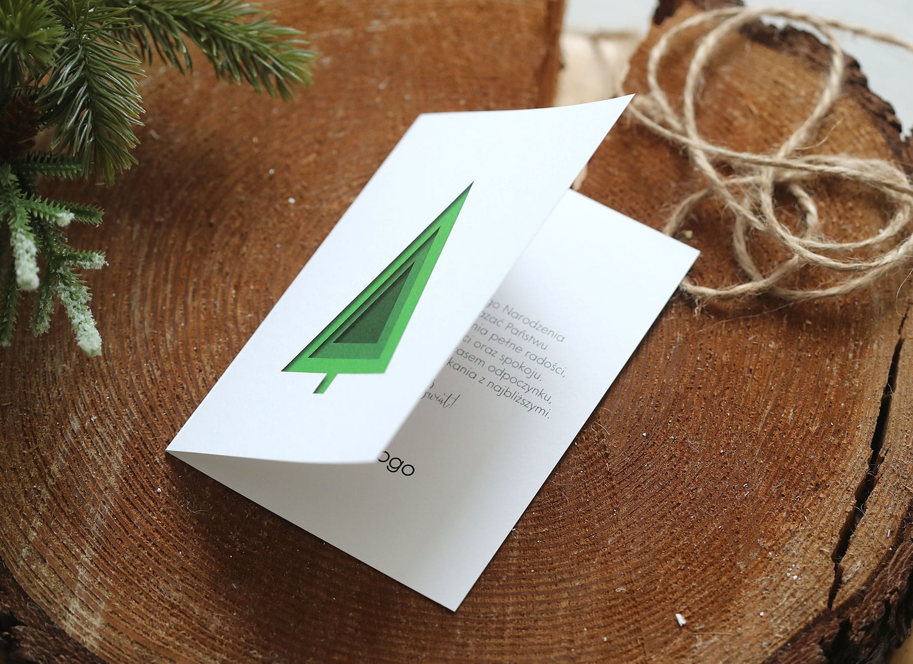 Kartka firmowa świąteczno-noworoczna z zieloną choinką z efektem wyciętego papieru