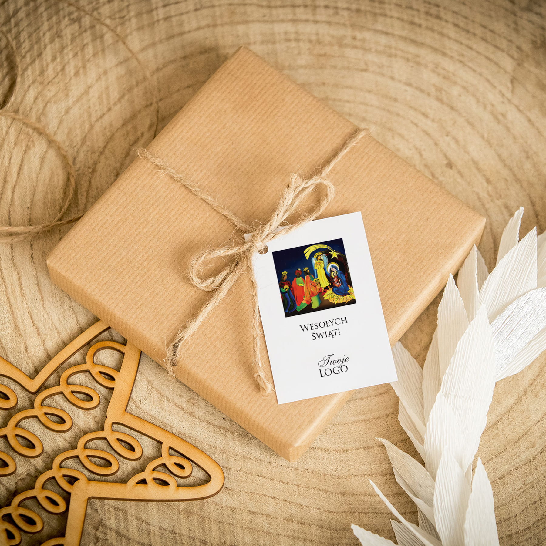 Świąteczne bileciki z logo z akwarelową szopką Bożonarodzeniową