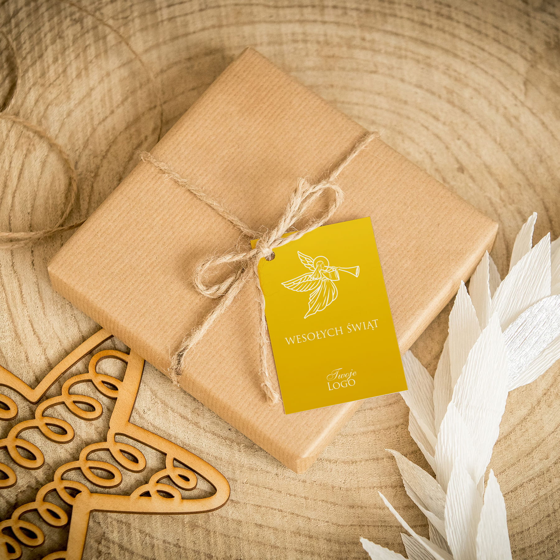 Świąteczne bileciki z logo z aniołem na żółtym tle