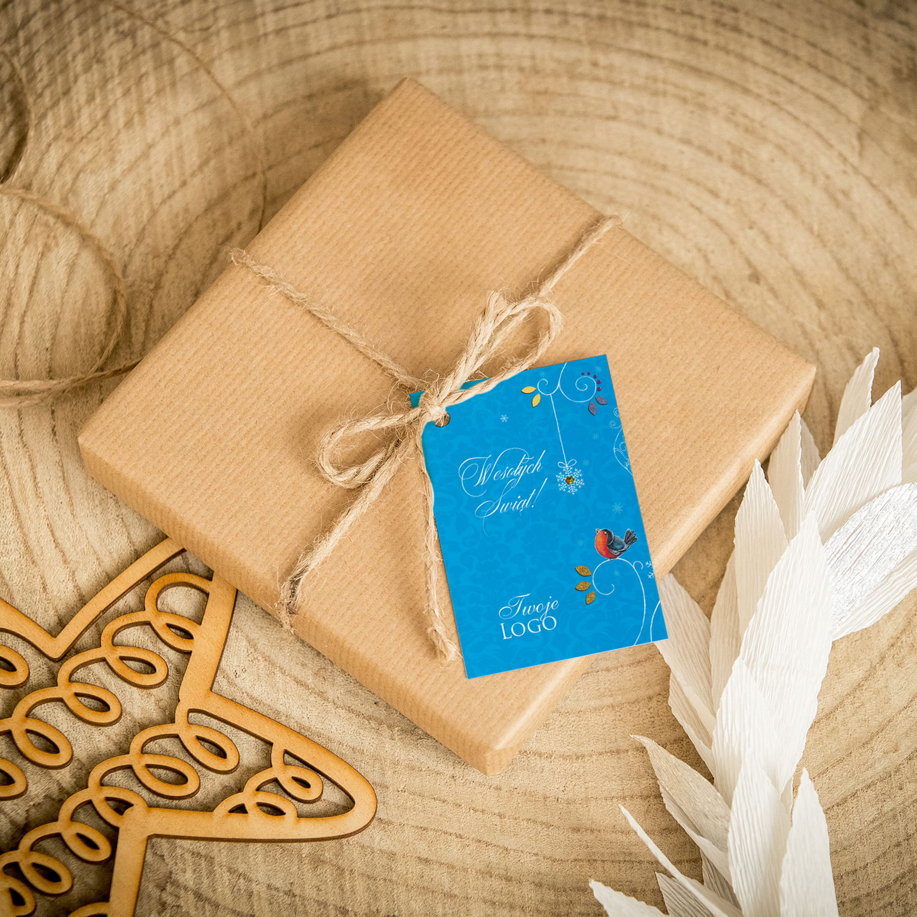 Świąteczne bileciki z logo z ilustracją na niebieskim tle