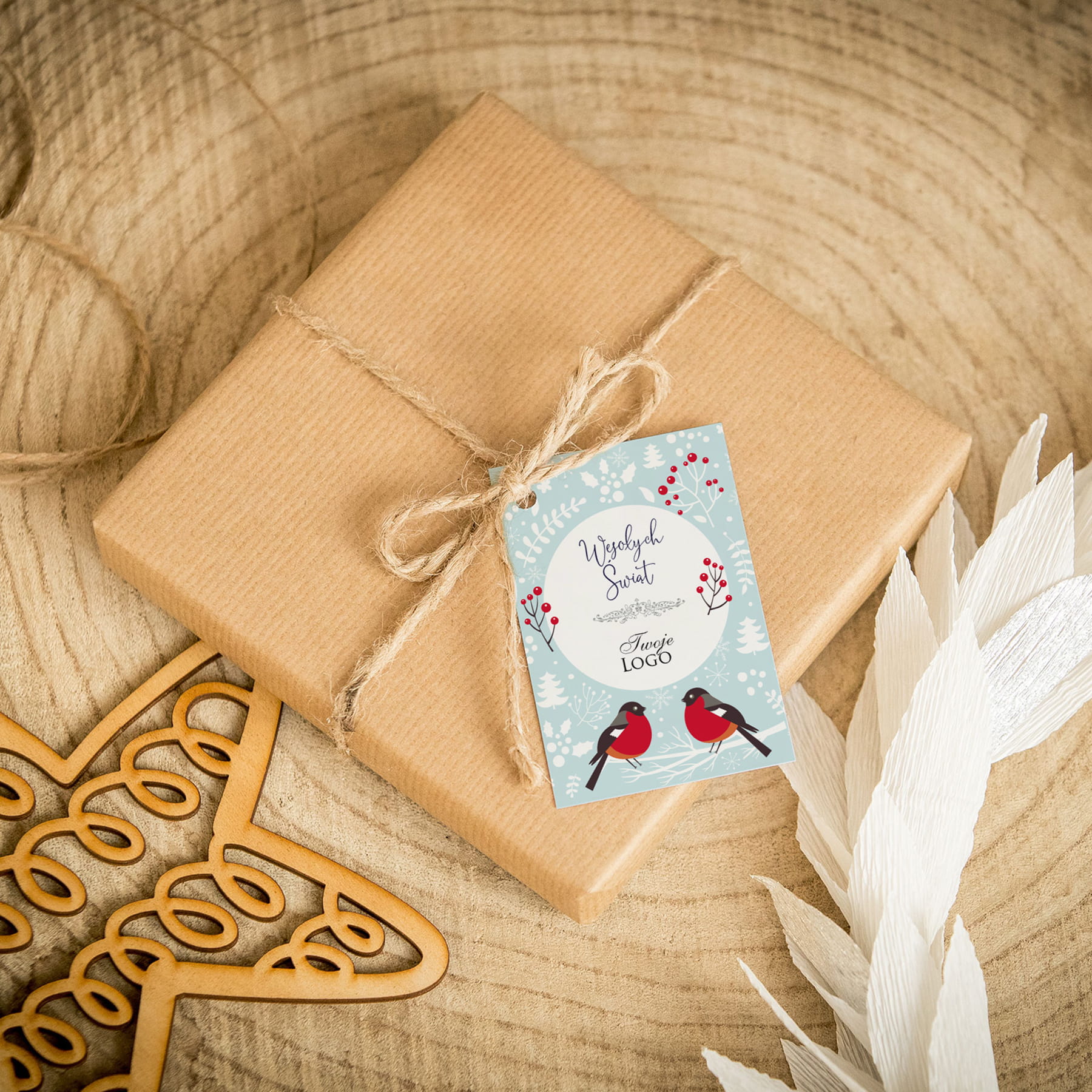 Świąteczne bileciki z logo z ptaszkami na niebieskim tle
