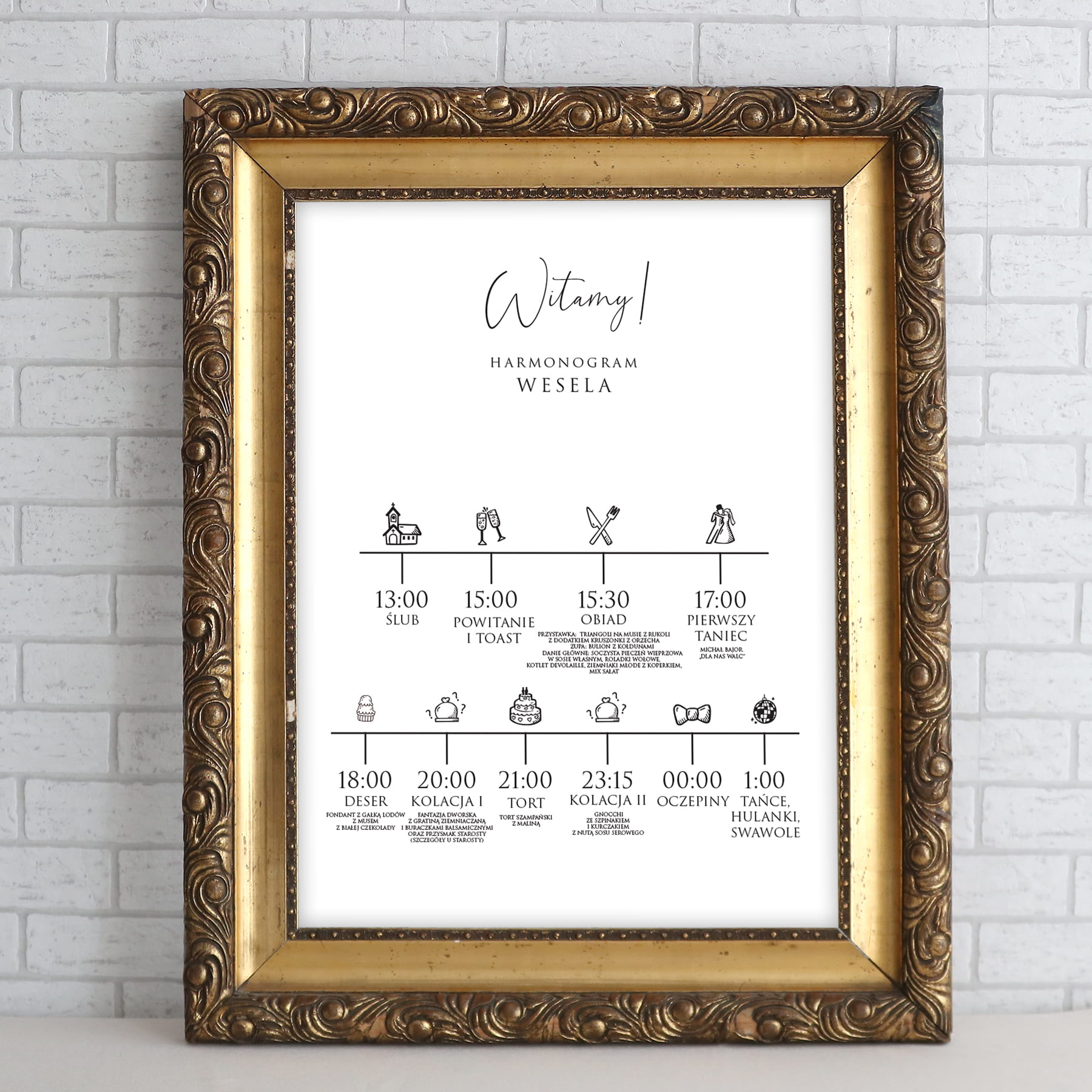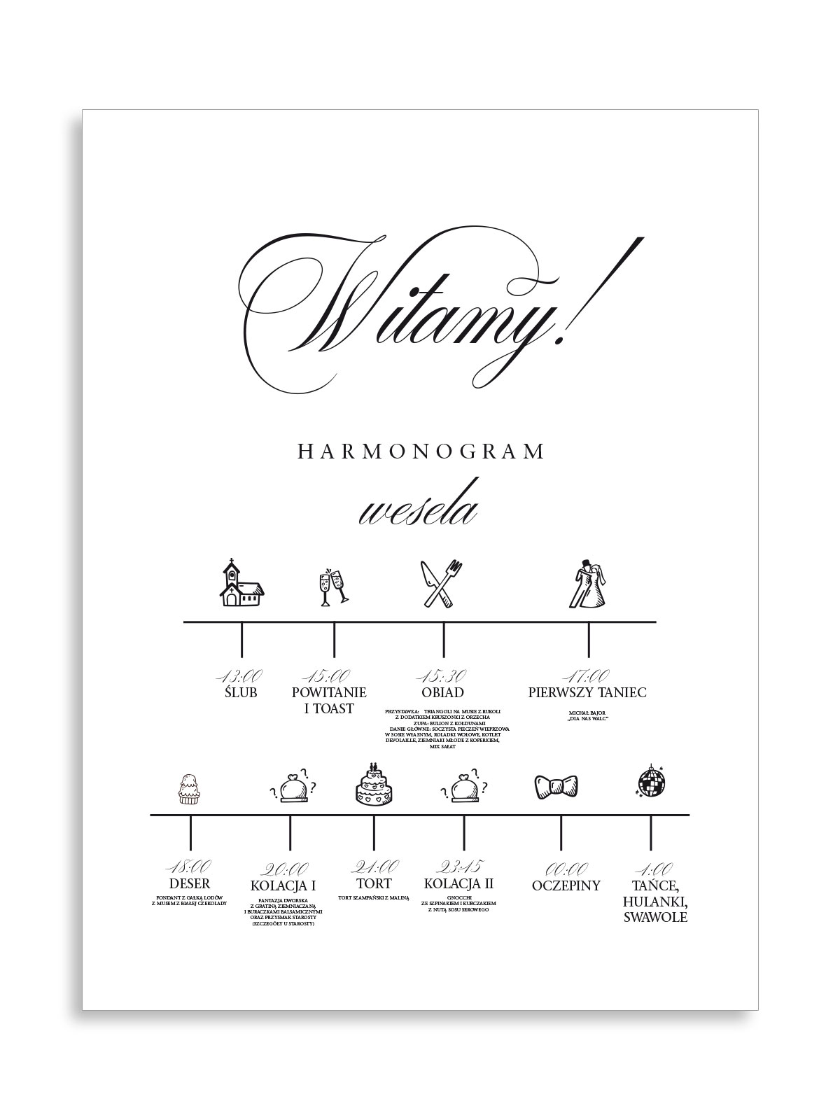 - Harmonogram wesela - jeśli chcecie poinformować Gości o planie waszego przyjęcia, o dodatkowych wydarzeniach np. sztucznych ogniach, iskierkach miłości, oczepinach, torcie lub godzinie zakończenia przyjęcia - przygotujcie harmonogram wesela, dołączcie plik z planem, my zaprojektujemy go i wyślemy do akceptacji przez was.