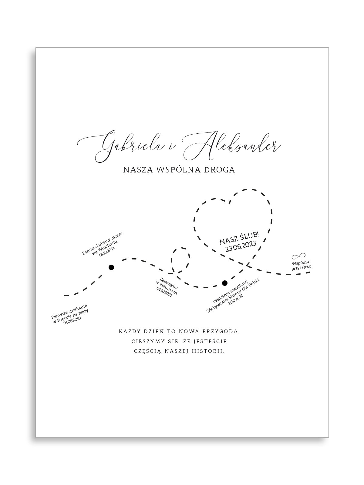 Napiszcie w punktach najważniejsze punkty waszego poznania się aż do momentu ślubu np. Pierwsze spotkania, pierwsza randka, pierwsze wspólne wakacje, zaręczyny itp. My ułożymy je w historię i ozdobimy grafiką.