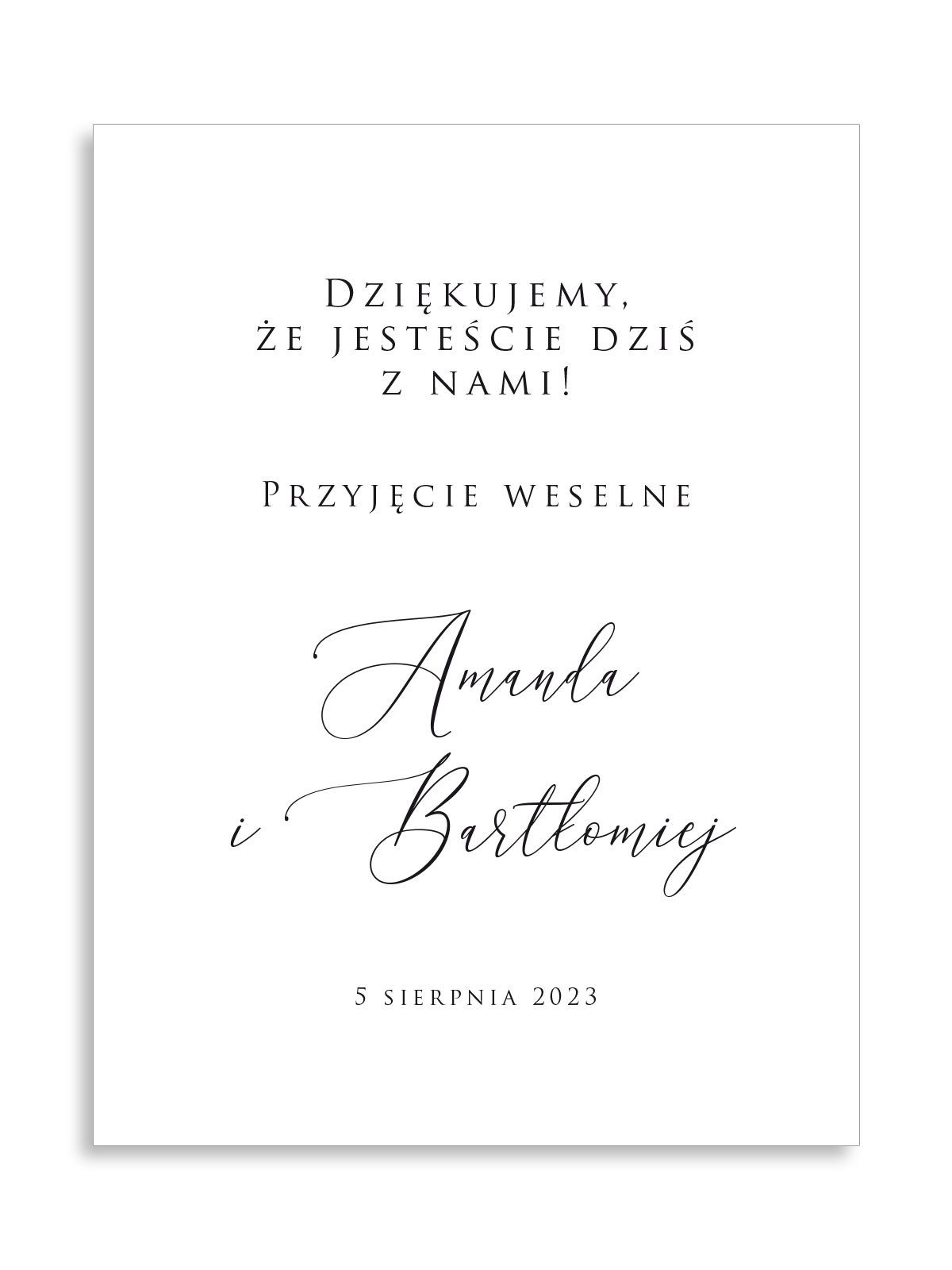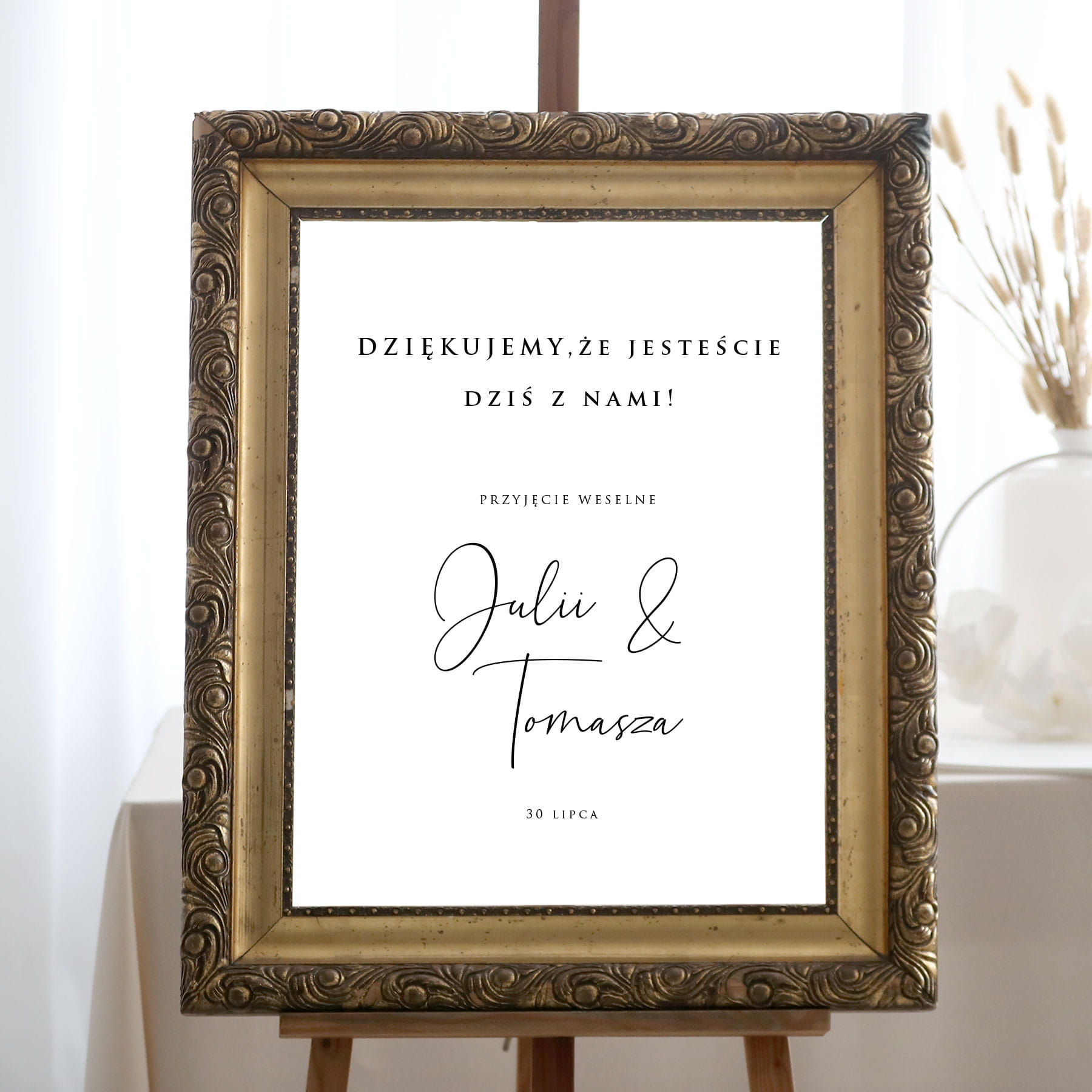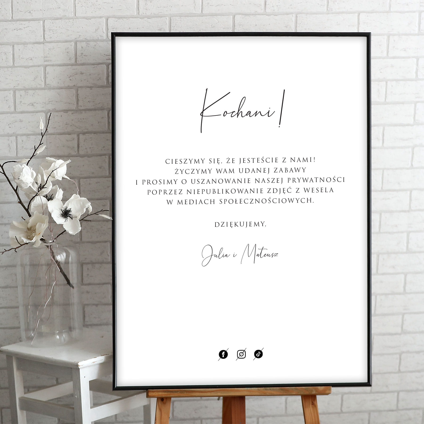 Minimalistyczny plakat powitalny / informacyjny na przyjęcie weselne.