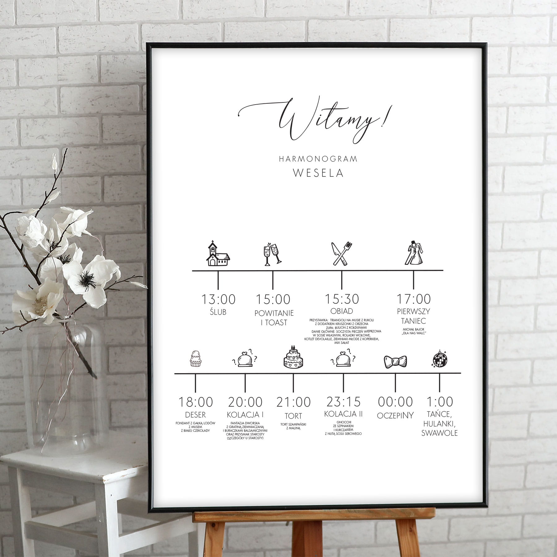 - Harmonogram wesela - jeśli chcecie poinformować Gości o planie waszego przyjęcia, o dodatkowych wydarzeniach np. sztucznych ogniach, iskierkach miłości, oczepinach, torcie lub godzinie zakończenia przyjęcia - przygotujcie harmonogram wesela, dołączcie plik z planem, my zaprojektujemy go i wyślemy do akceptacji przez was.