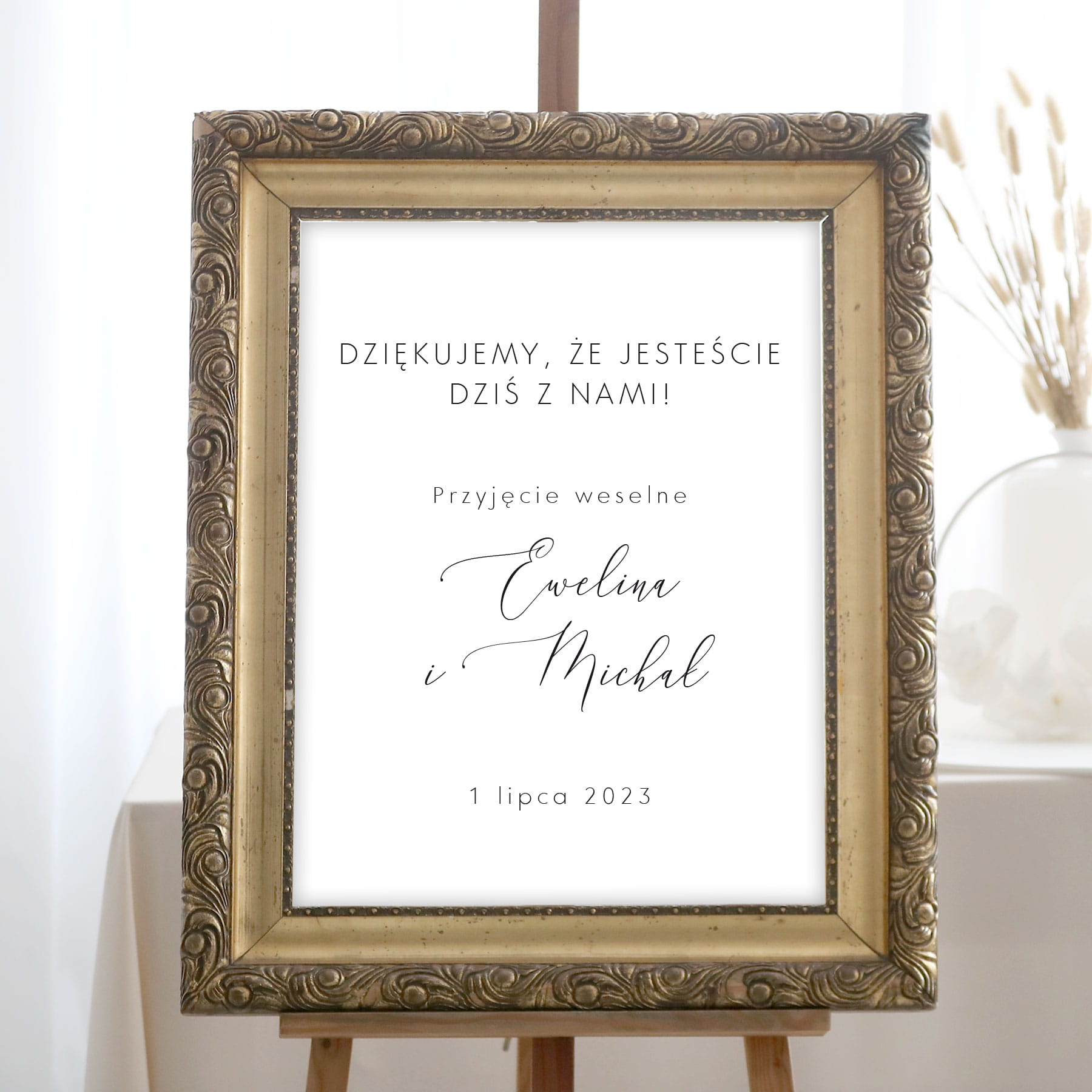 Minimalistyczny plakat powitalny / informacyjny na przyjęcie weselne.