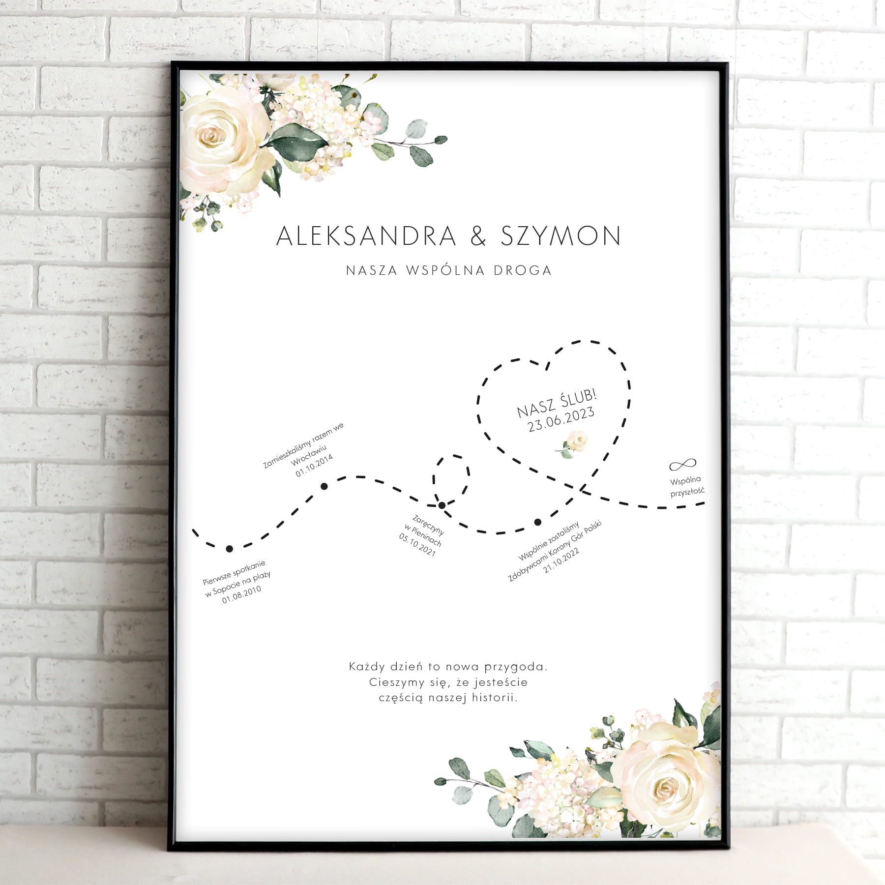 Napiszcie w punktach najważniejsze punkty waszego poznania się aż do momentu ślubu np. Pierwsze spotkania, pierwsza randka, pierwsze wspólne wakacje, zaręczyny itp. My ułożymy je w historię i ozdobimy grafiką.
