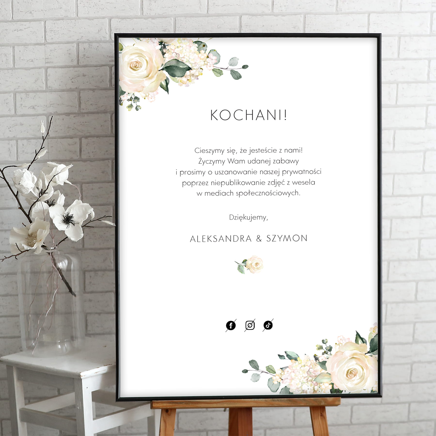 Plakat powitalny / informacyjny na przyjęcie weselne z białymi różami.