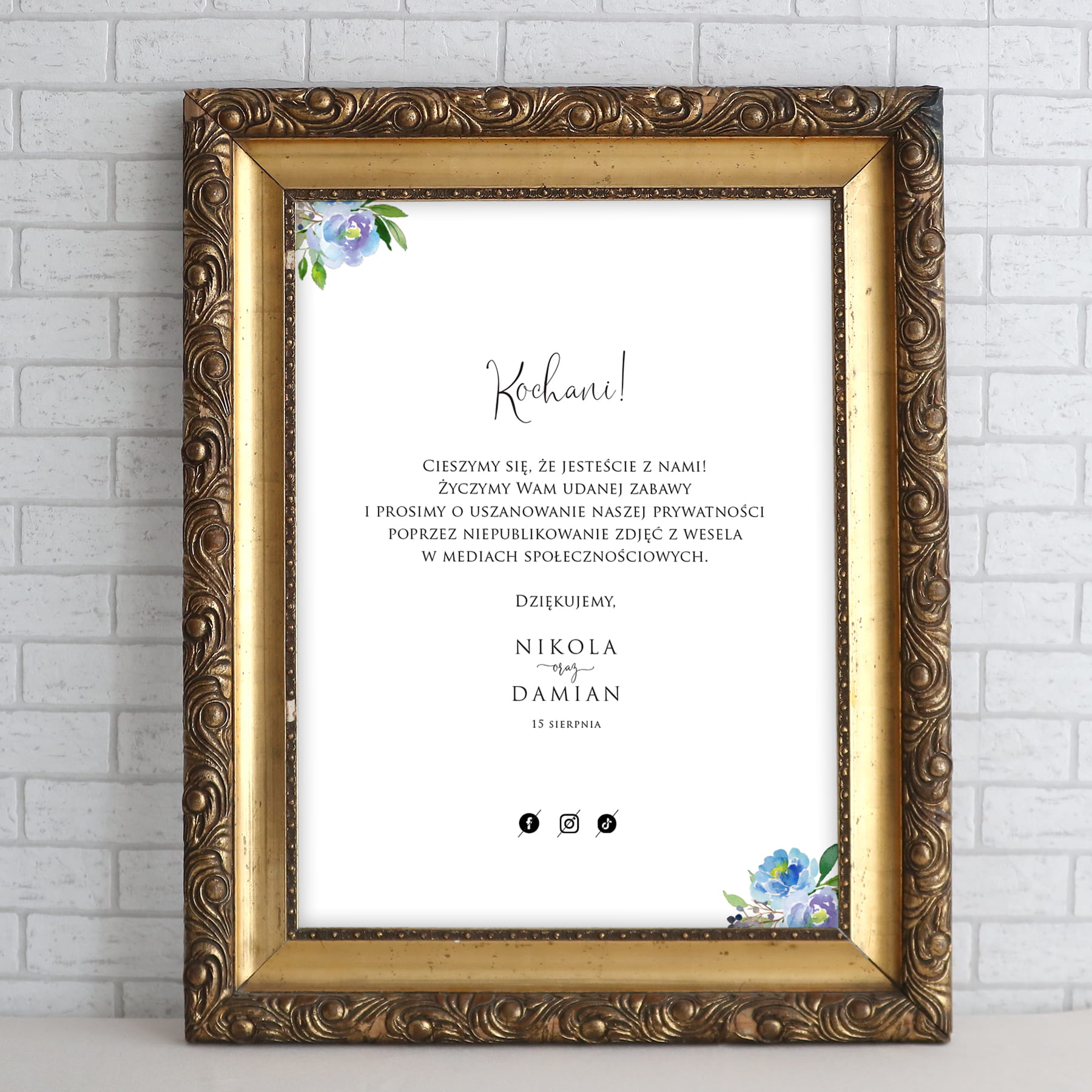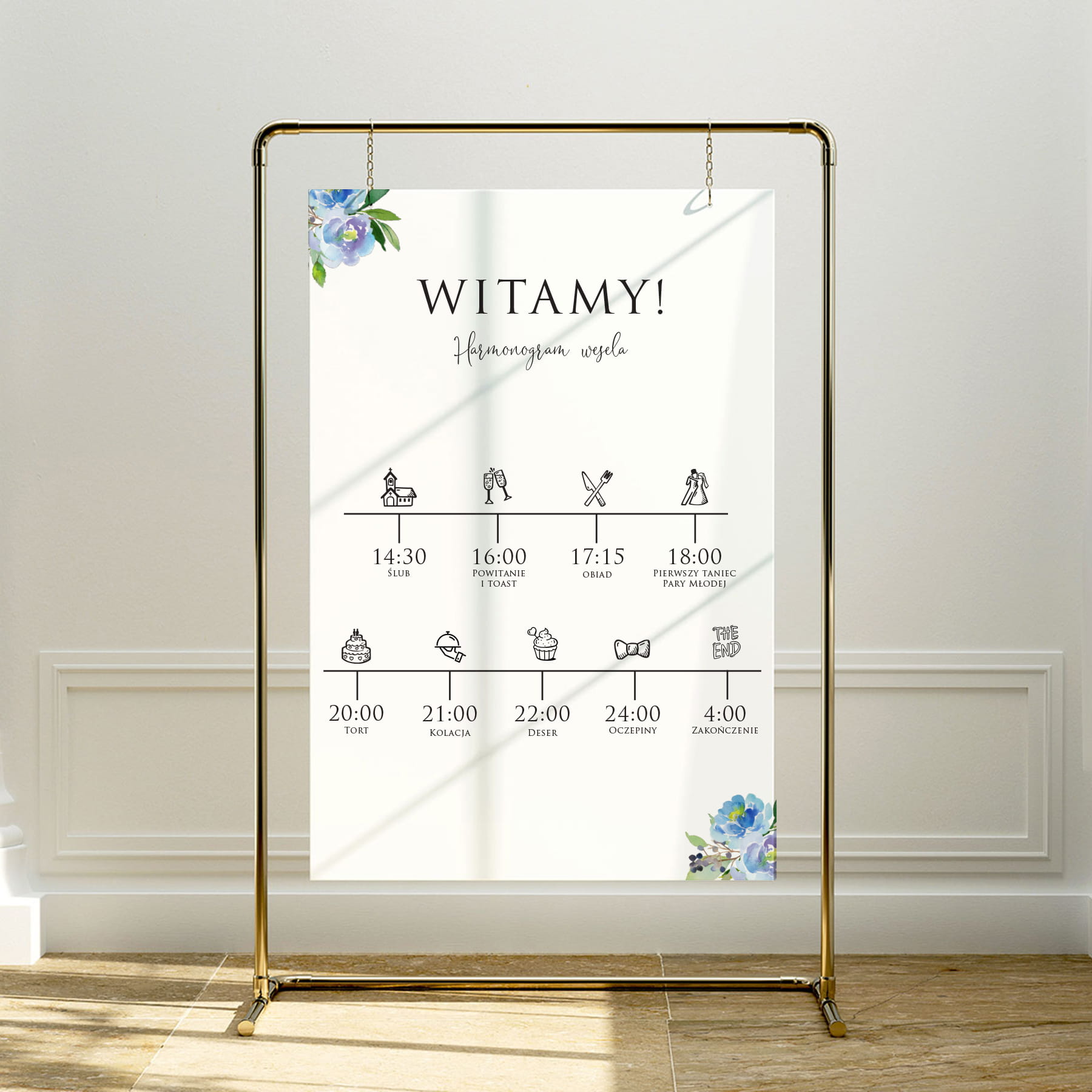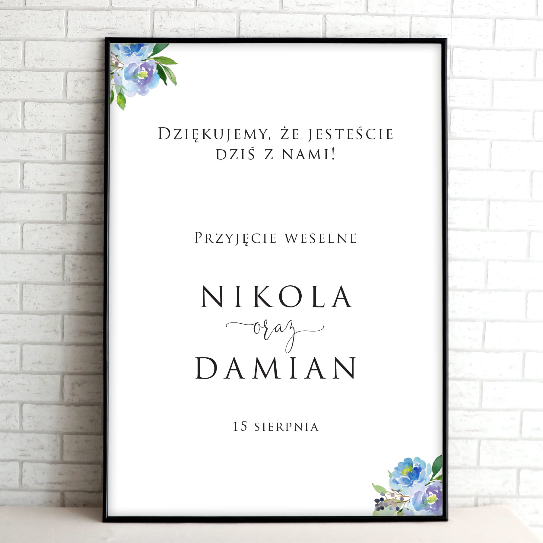 Plakat powitalny / informacyjny na przyjęcie weselne z niebieskimi kwiatami