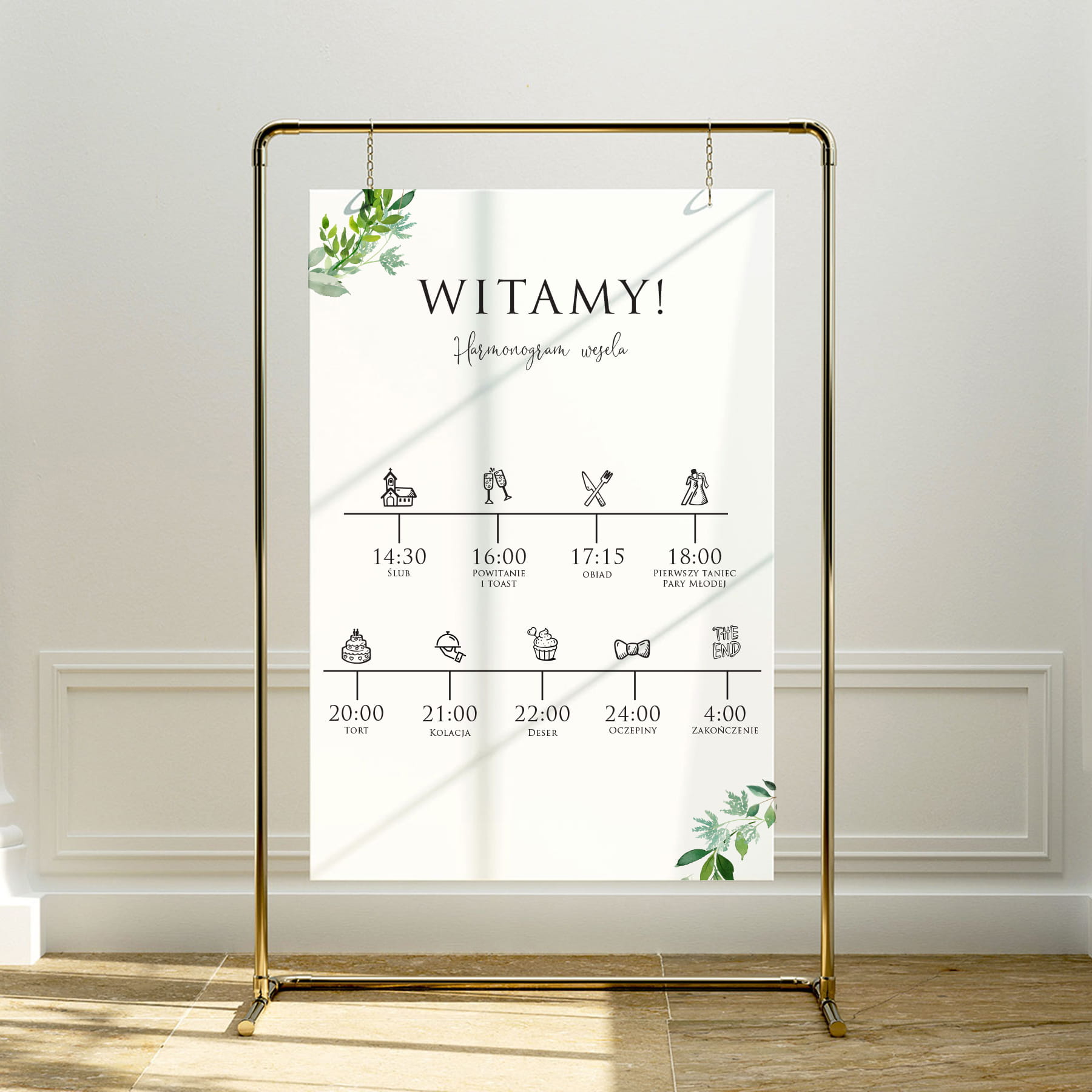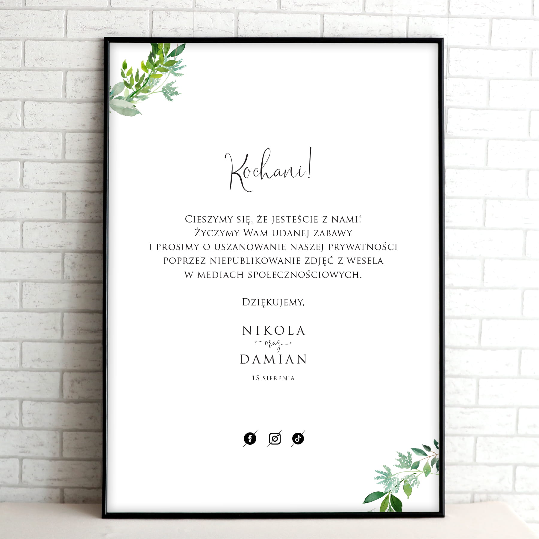 Plakat powitalny / informacyjny na przyjęcie weselne z zielonymi listkami