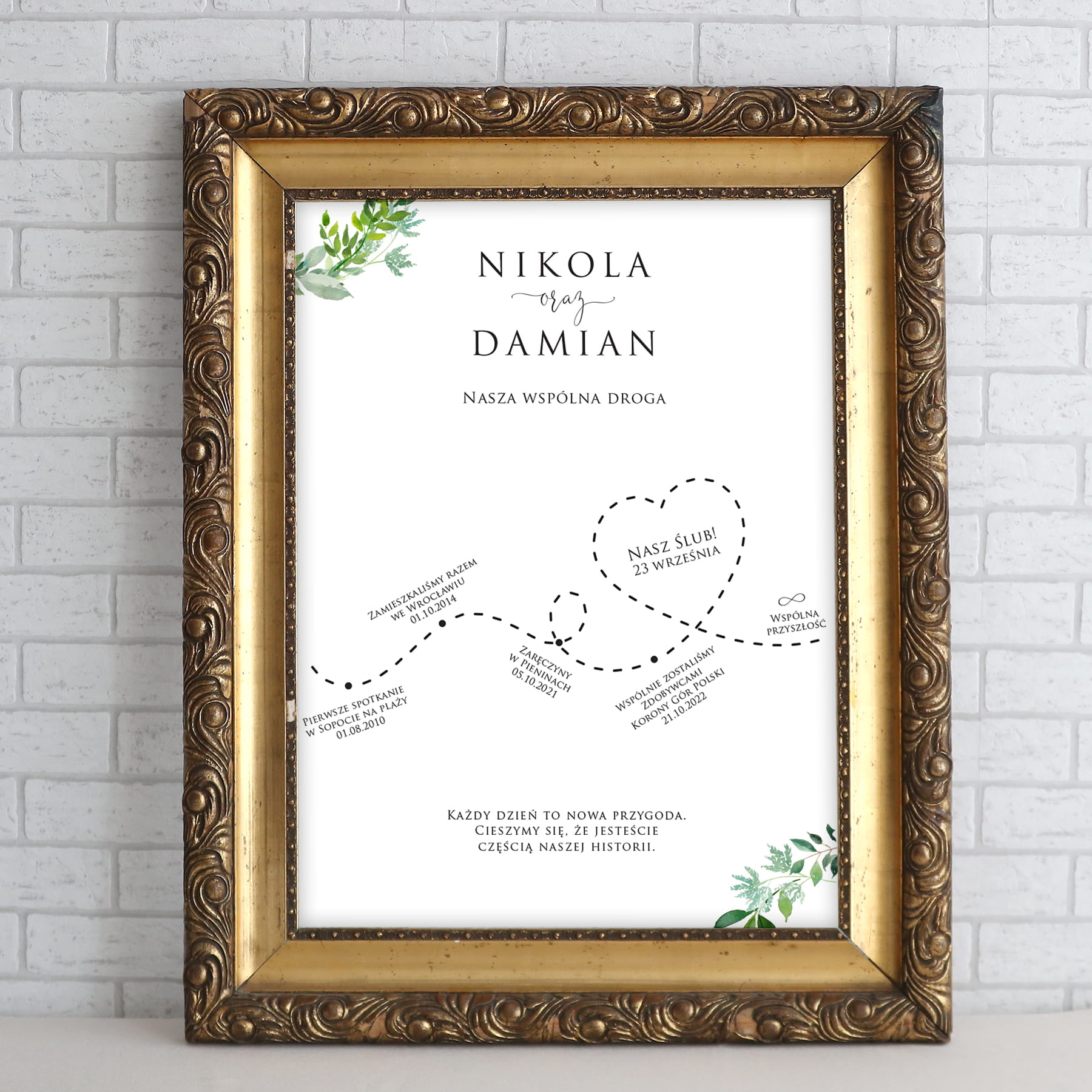 Napiszcie w punktach najważniejsze punkty waszego poznania się aż do momentu ślubu np. Pierwsze spotkania, pierwsza randka, pierwsze wspólne wakacje, zaręczyny itp. My ułożymy je w historię i ozdobimy grafiką.