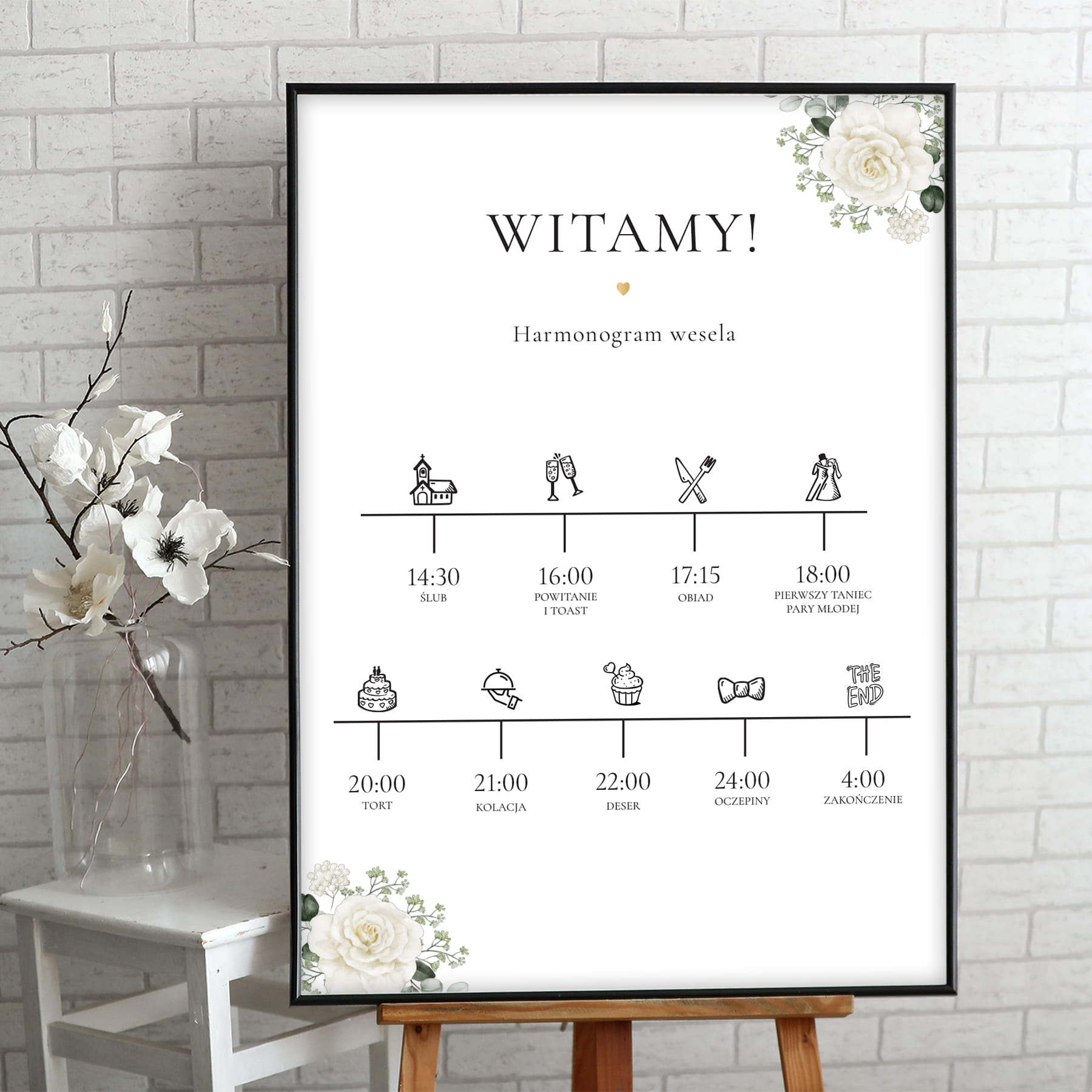 Plakat powitalny / informacyjny na przyjęcie weselne z różą, gipsówką i listkami eukaliptusa