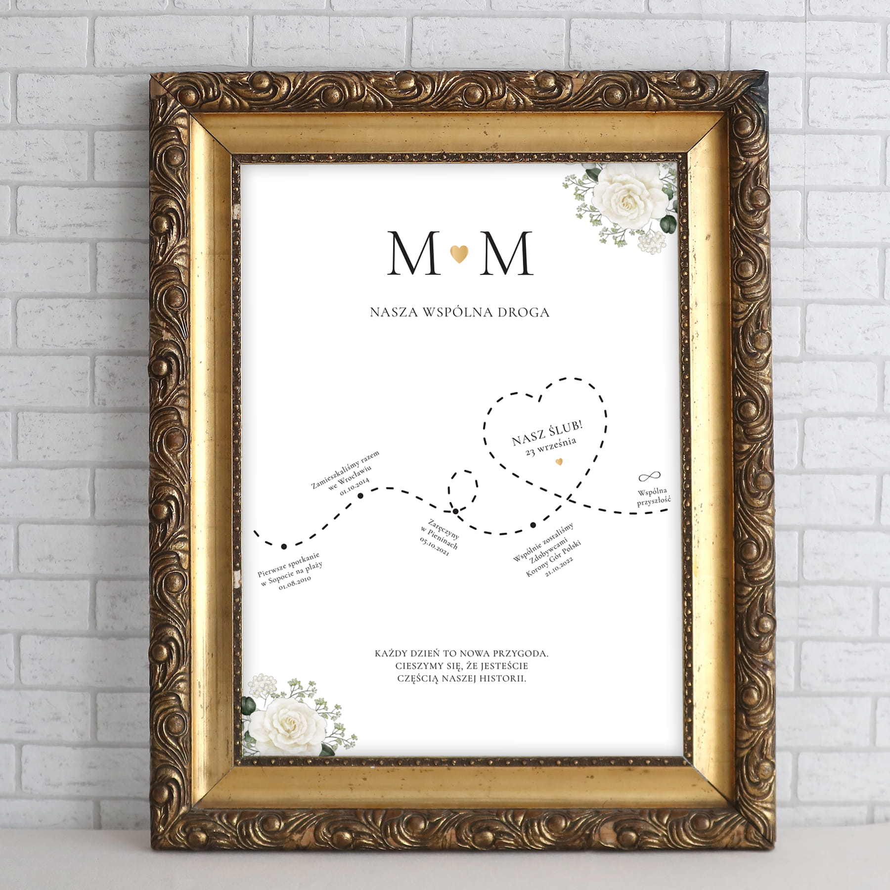 Napiszcie w punktach najważniejsze punkty waszego poznania się aż do momentu ślubu np. Pierwsze spotkania, pierwsza randka, pierwsze wspólne wakacje, zaręczyny itp. My ułożymy je w historię i ozdobimy grafiką.