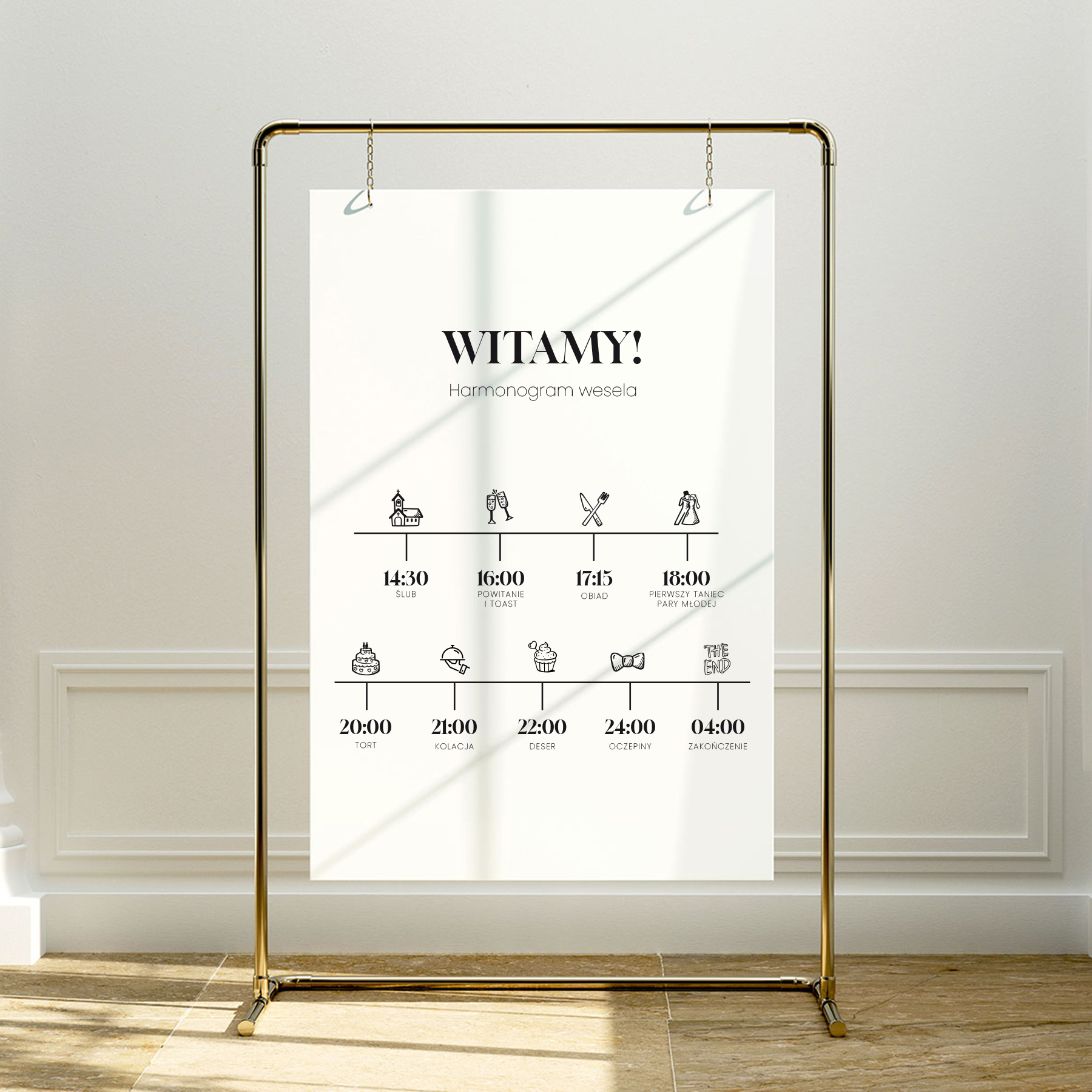 - Harmonogram wesela - jeśli chcecie poinformować Gości o planie waszego przyjęcia, o dodatkowych wydarzeniach np. sztucznych ogniach, iskierkach miłości, oczepinach, torcie lub godzinie zakończenia przyjęcia - przygotujcie harmonogram wesela, dołączcie plik z planem, my zaprojektujemy go i wyślemy do akceptacji przez was.