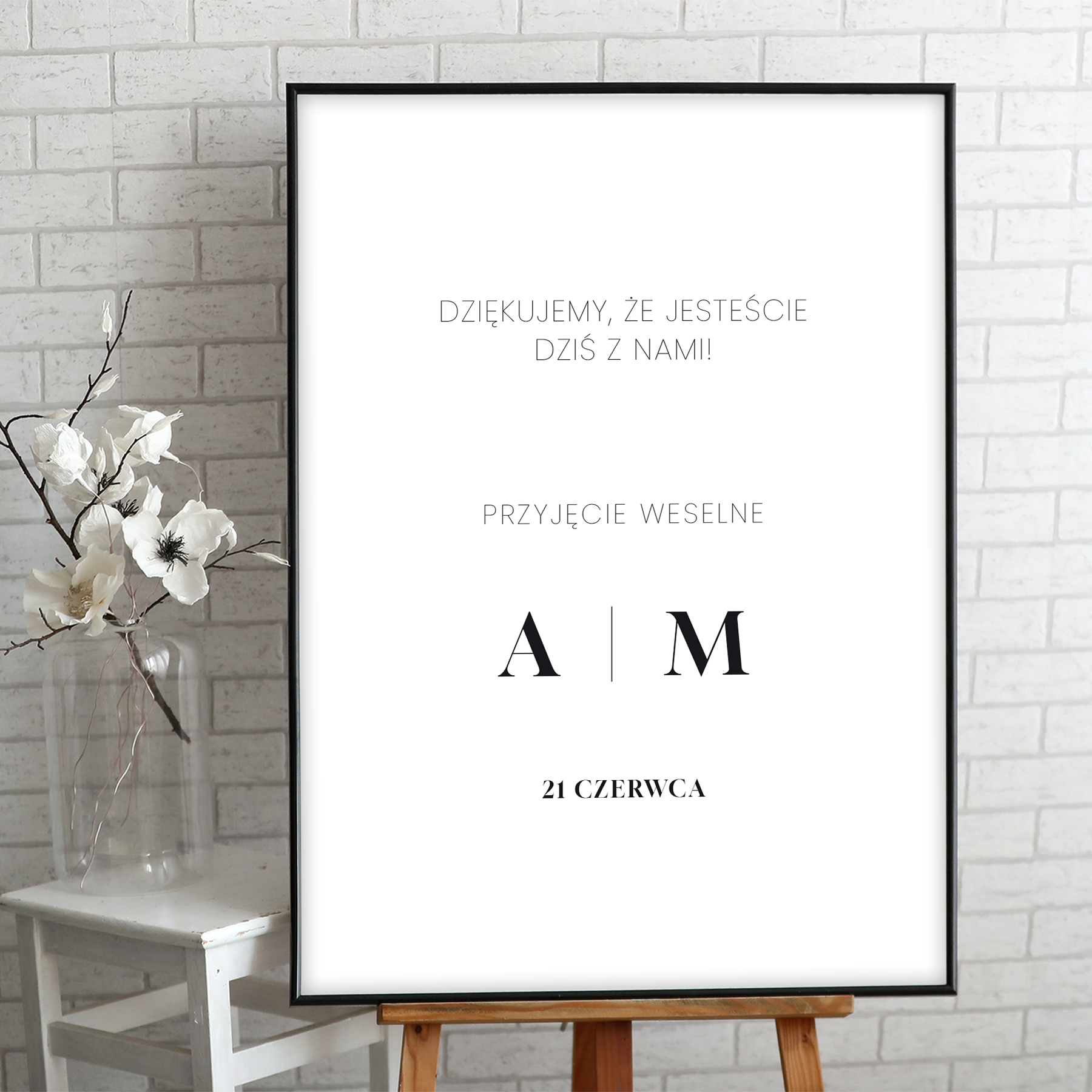 Plakat powitalny / informacyjny na przyjęcie weselne z minimalistycznymi inicjałami