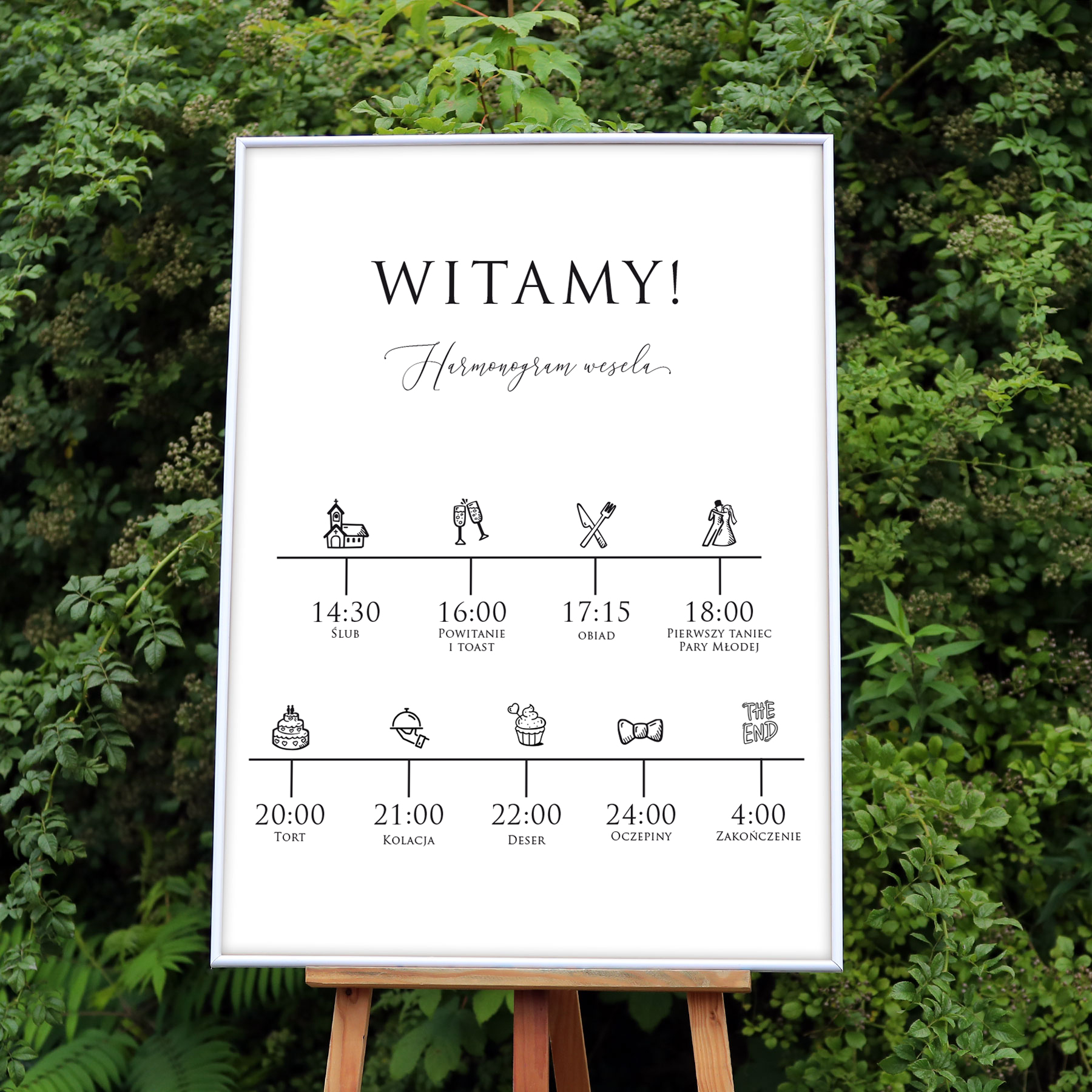 - Harmonogram wesela - jeśli chcecie poinformować Gości o planie waszego przyjęcia, o dodatkowych wydarzeniach np. sztucznych ogniach, iskierkach miłości, oczepinach, torcie lub godzinie zakończenia przyjęcia - przygotujcie harmonogram wesela, dołączcie plik z planem, my zaprojektujemy go i wyślemy do akceptacji przez was.