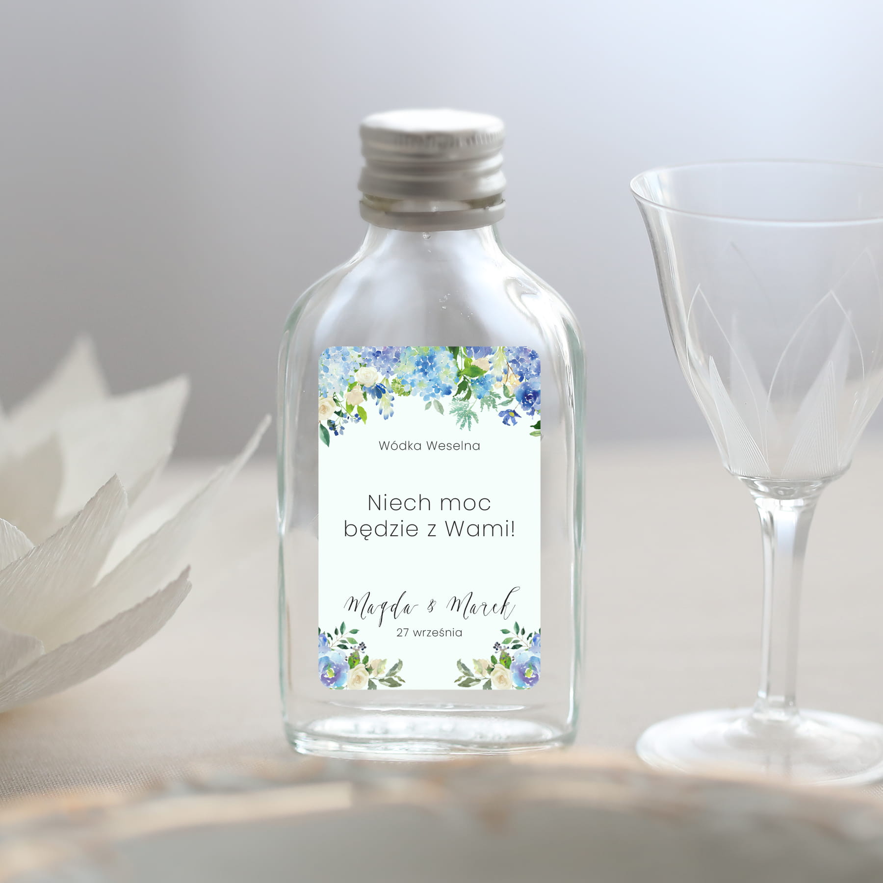 Eleganckie naklejki na butelki ze wzorem z niebieskim bukietem