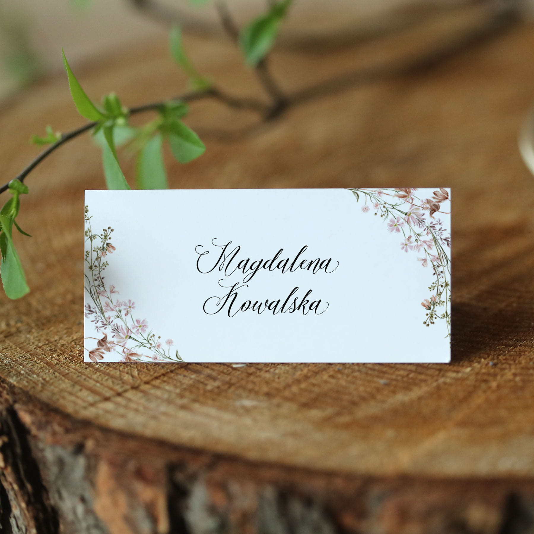 Piękne winietki na Twój stół, łączące kaligraficzną czcionkę z delikatnymi, akwarelowymi motywami polnych kwiatów i traw w wianku.