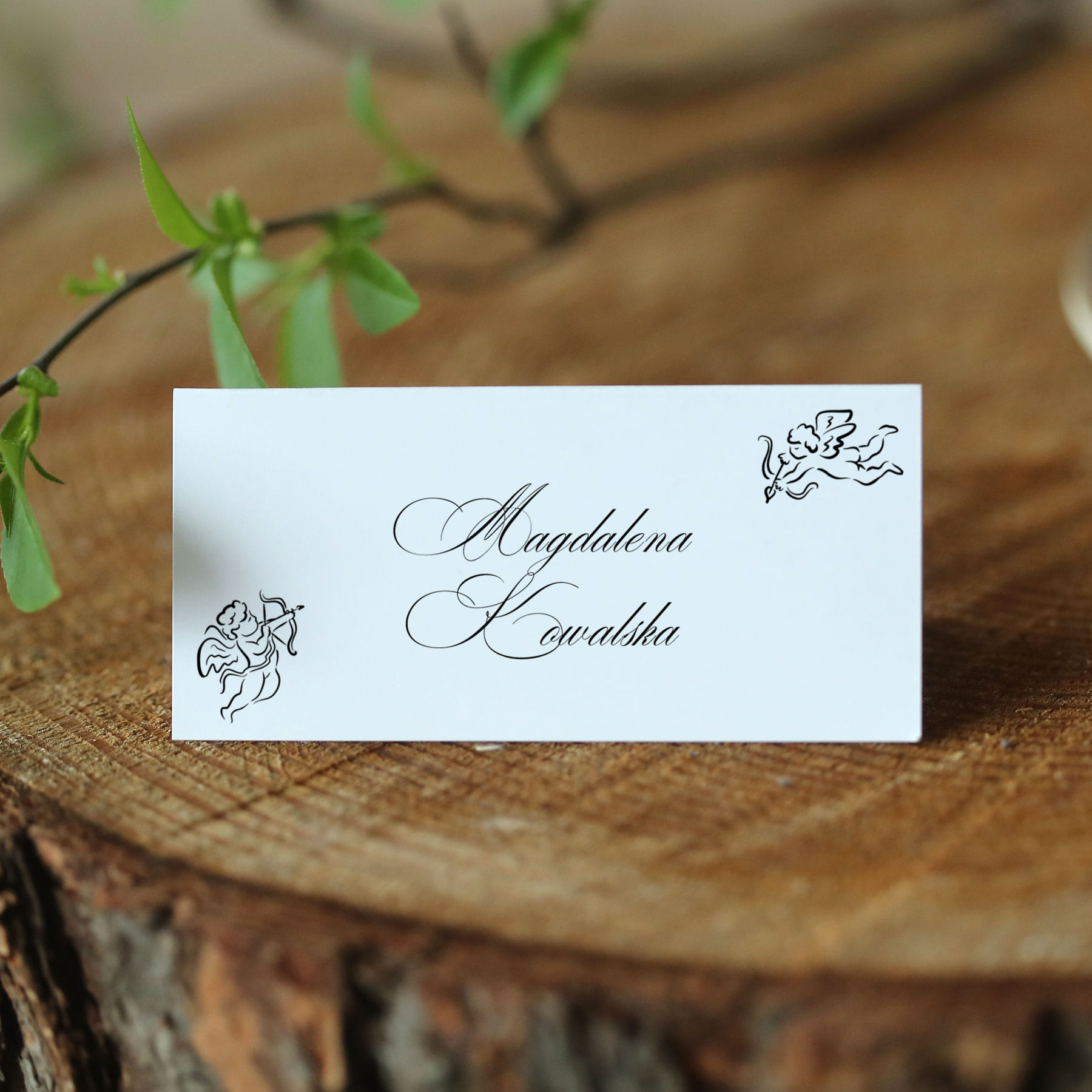 Piękne winietki na Twój stół ozdobione delikatnymi, czarnymi grafikami amorków w narożnikach.