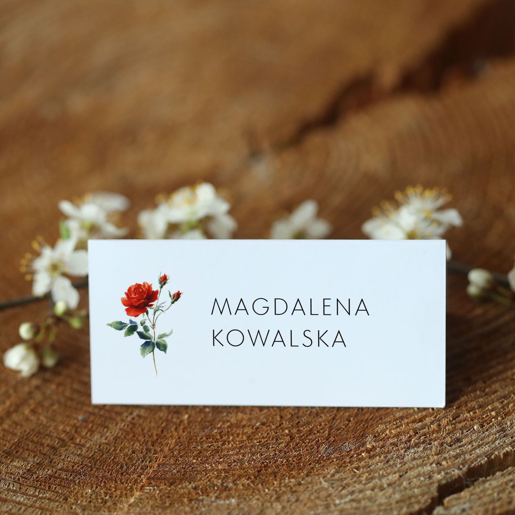 Piękne winietki na Twój stół z tradycyjnym motywem czerwonej róży i nowoczesnym, minimalistycznym układem typograficznym.