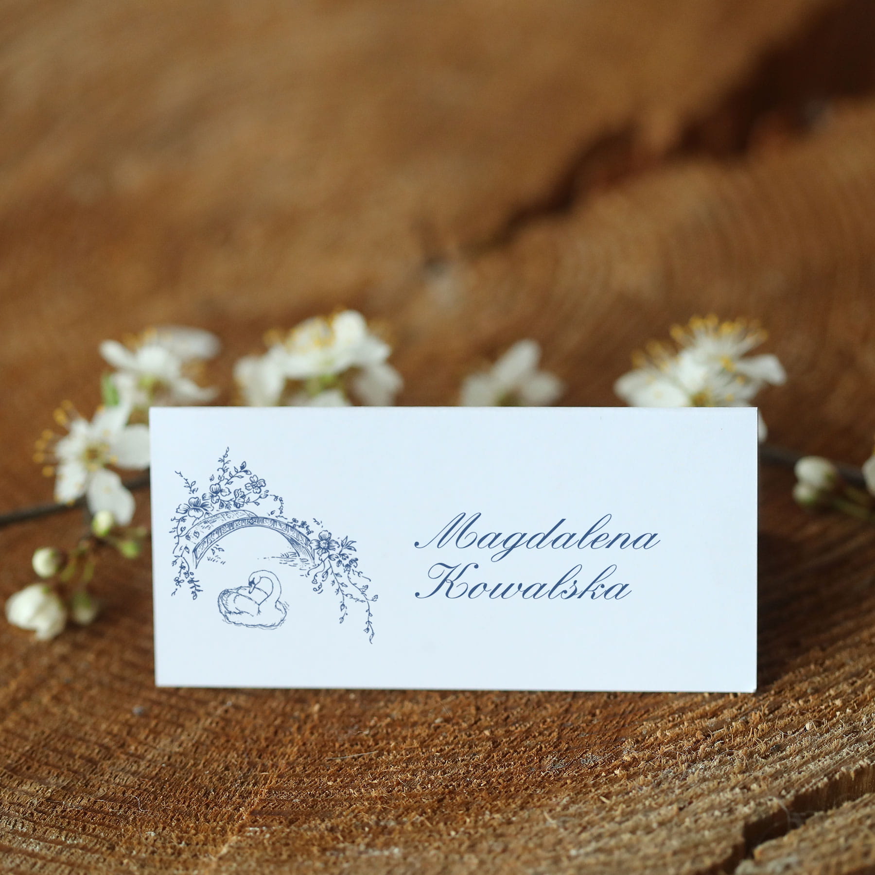 Piękne winietki na Twój stół z motywami wiktoriańskiej flory, łabędzi i mostu w kolorze granatowym