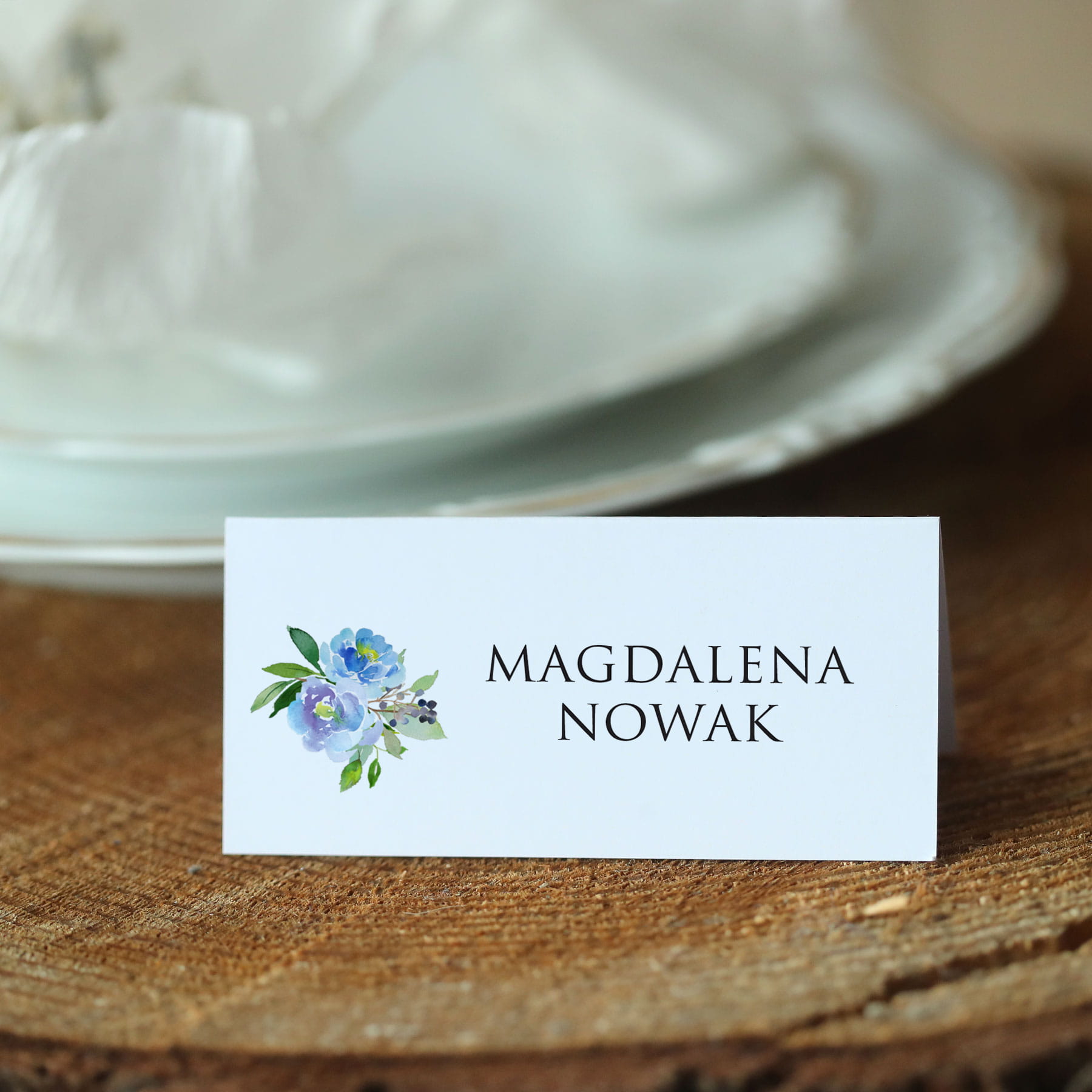 Piękne winietki na Twój stół z niebieskimi kwiatami.