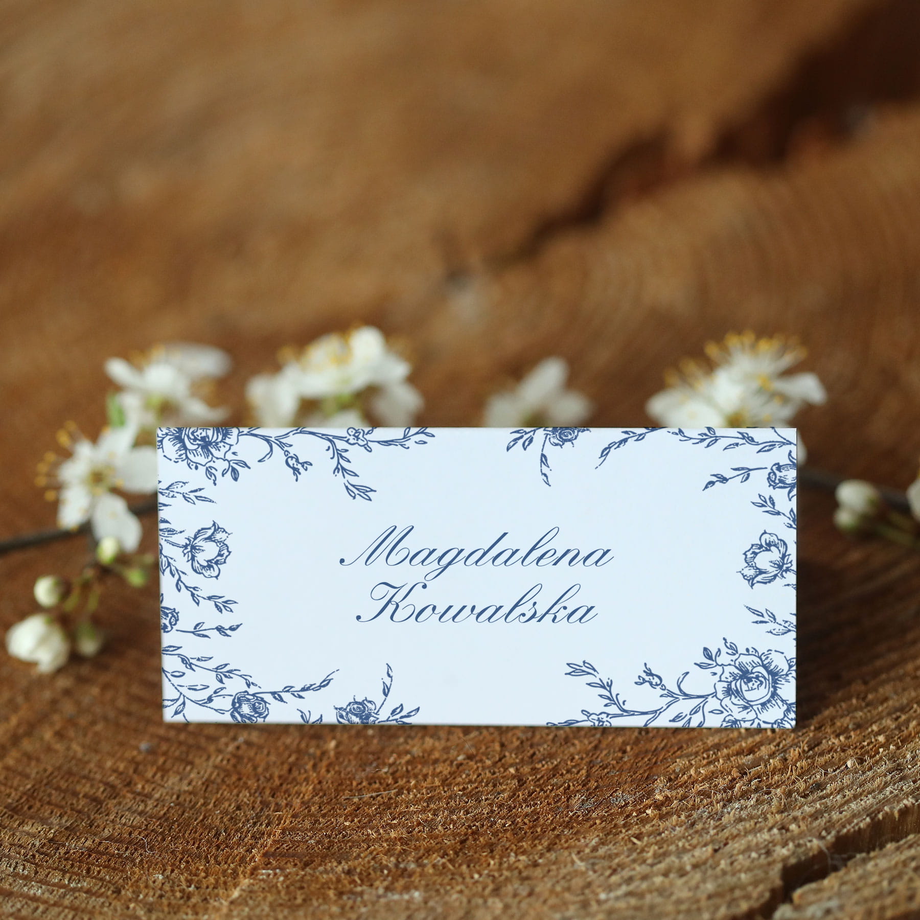 Piękne winietki na Twój stół z niebieskimi kwiatami.
