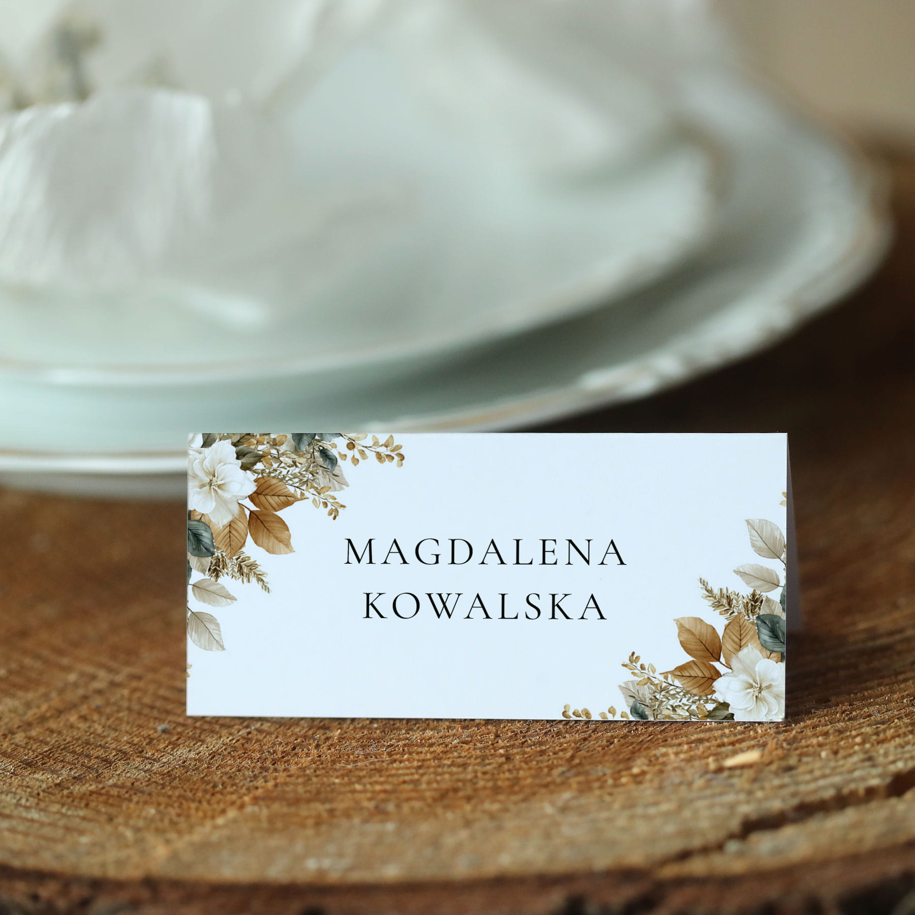 Piękne winietki na Twój stół z motywem jesiennych, złotych liści i białych kwiatów.