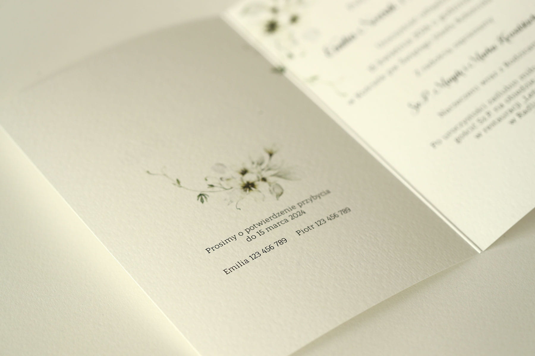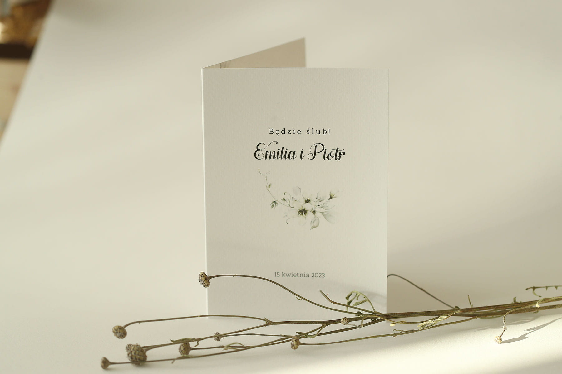 Gałązki kwiatów w narożnikach dopełniają środek zaproszenia.