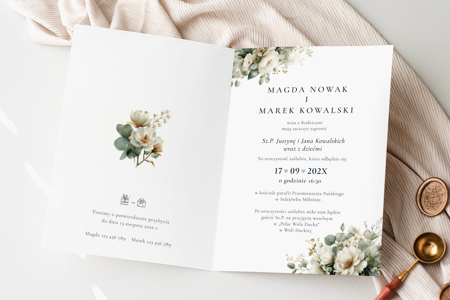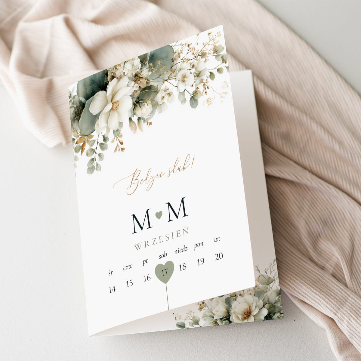 Zaproszenia Ślubne z Kalendarzem i Akwarelowymi Kwiatami - Eukaliptusowa Elegancja - rozkładane 12x17