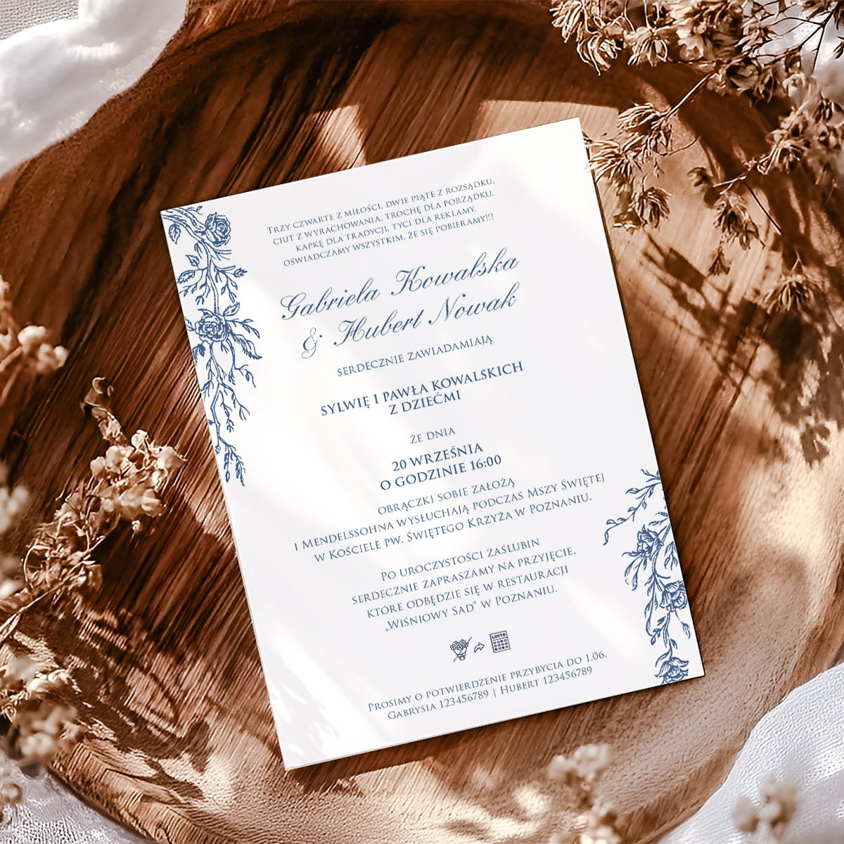 Dołącz do zamówienia treść zaproszenia uzupełnioną o wasze dane, miejsce ślubu i przyjęcia, telefonami z imionami do potwierdzenia, oraz wybrane cytaty i rebusy.