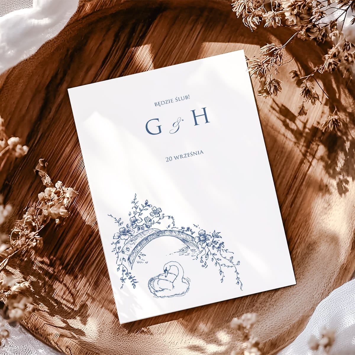 To zaproszenie łączy klasyczną elegancję i tradycyjne wzornictwo z motywami wiktoriańskiej flory, łabędzi i mostu w kolorze granatowym,