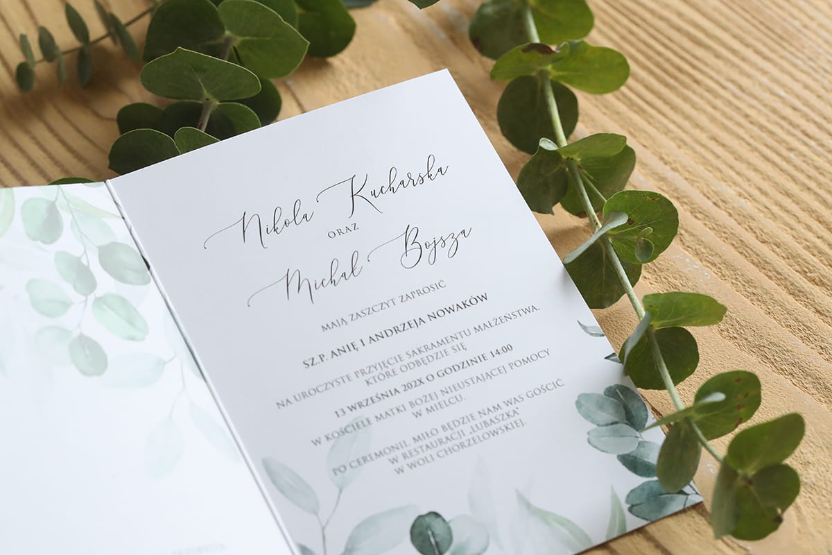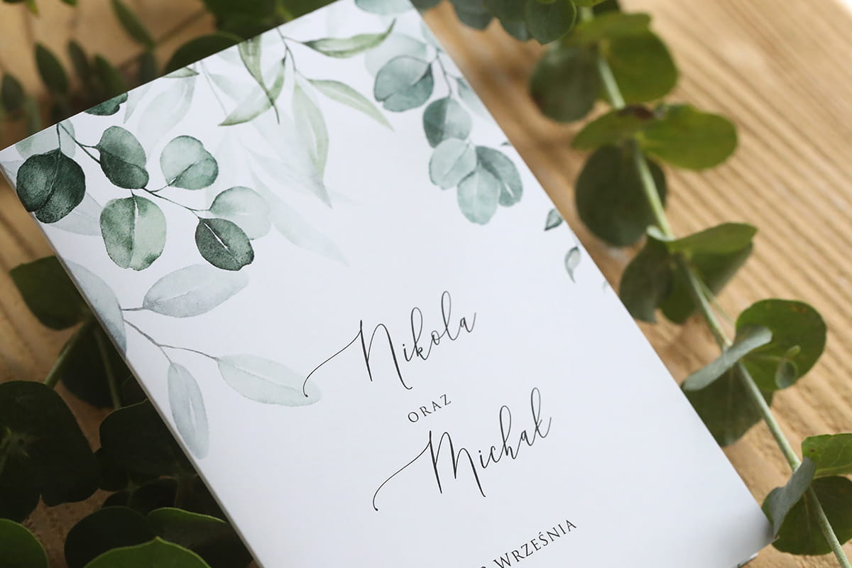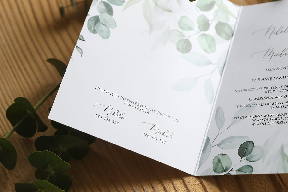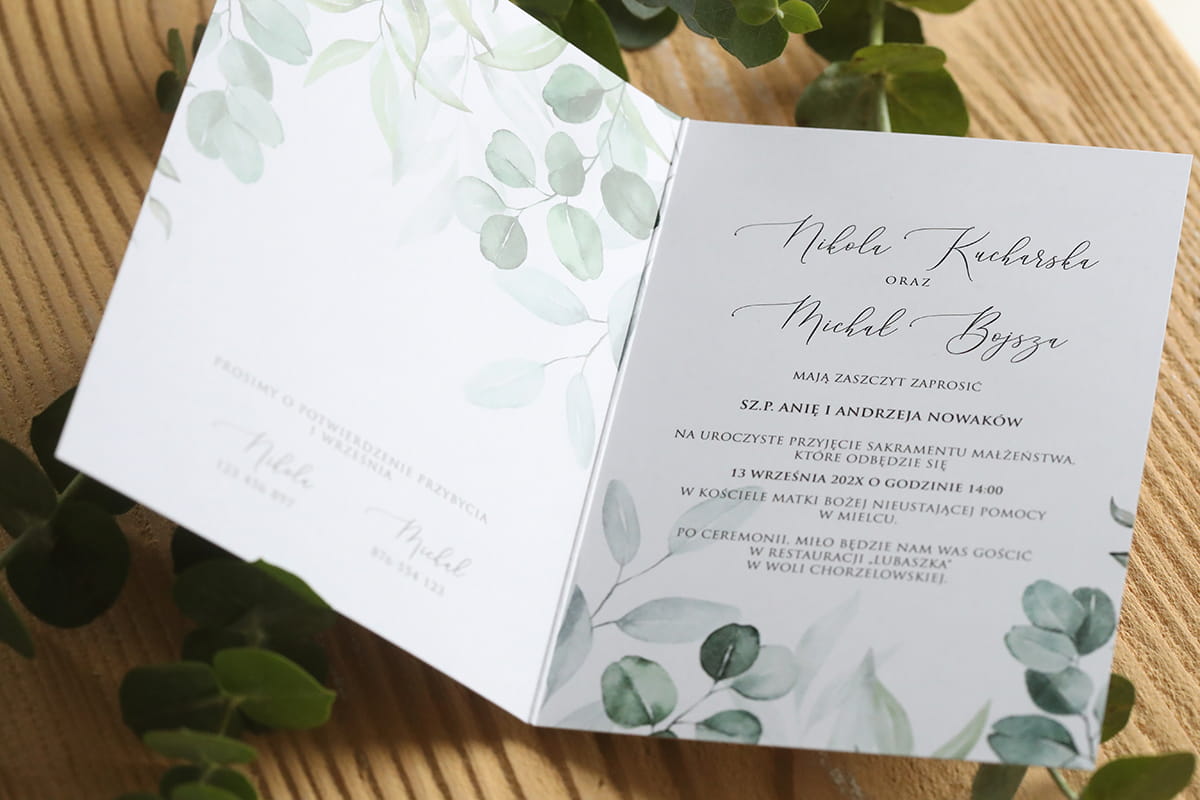 Grafika tego zaproszenia to listki eukaliptusa – delikatna, akwarelowa kompozycja w odcieniach zieleni, która emanuje naturalnym spokojem i subtelnym urokiem.