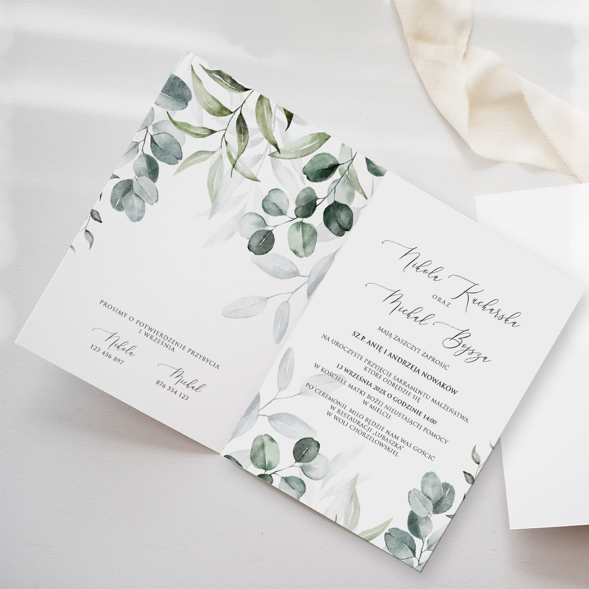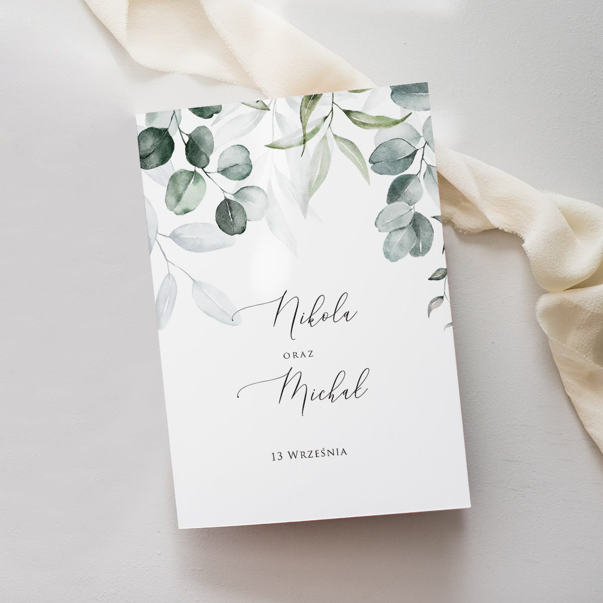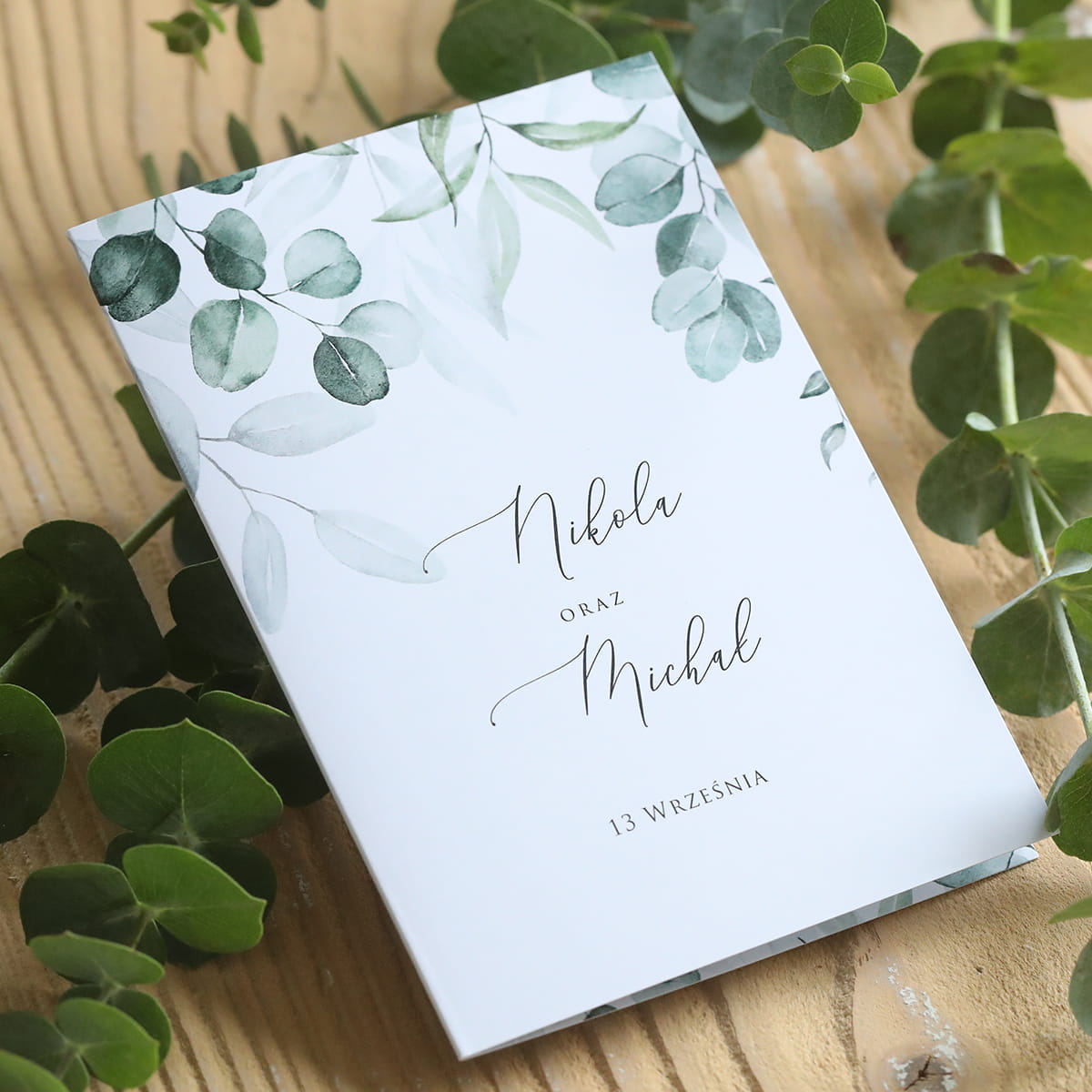 Grafika tego zaproszenia to listki eukaliptusa – delikatna, akwarelowa kompozycja w odcieniach zieleni, która emanuje naturalnym spokojem i subtelnym urokiem.