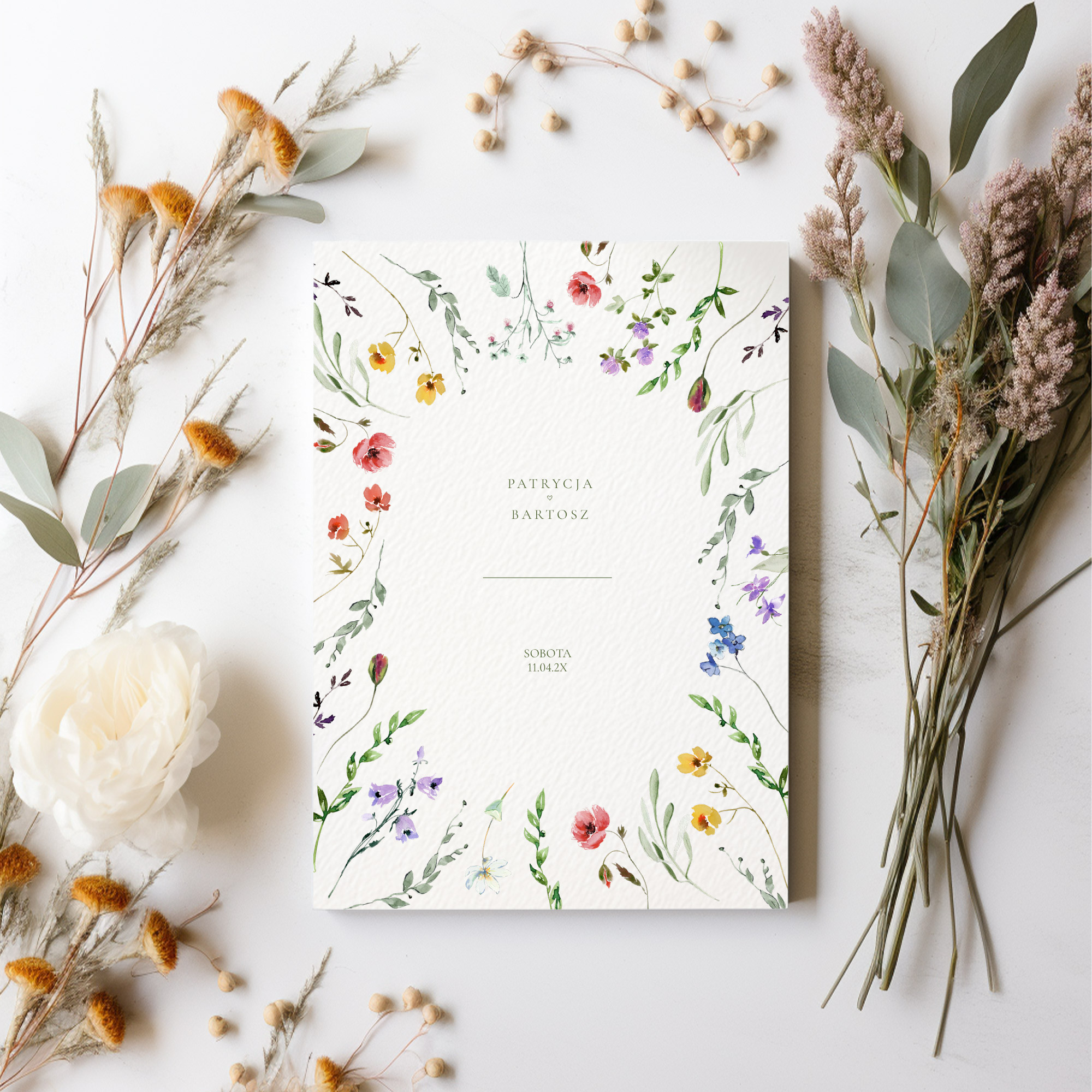 Stworzyłam tę kompozycję z myślą o naturalności, dlatego kwiatuszki wyglądają, jakby przed chwilą zostały zebrane z dzikiej łąki i delikatnie ułożone w ramkę. Styl to czyste fine art botanic – postawiłam na bardzo drobne linie i akwarelowe plamy, które nadają całości niesamowitej lekkości. To zaproszenie oddaje klimat swobodnego, radosnego wesela, gdzie liczy się autentyczność i bliskość natury.