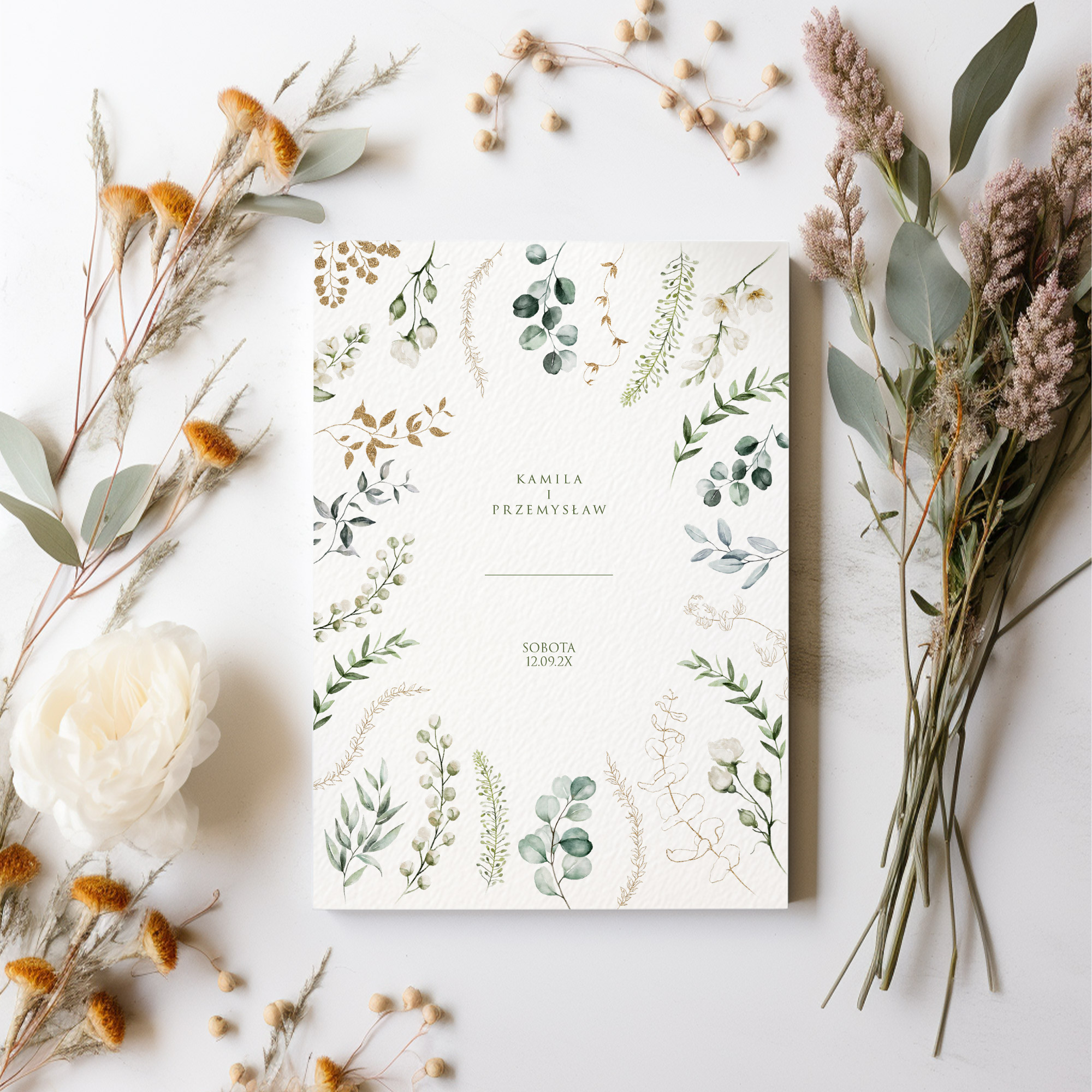 To zaproszenie to kwintesencja stylu botanicznego w wydaniu glamour, gdzie dzikość natury spotyka się z wyrafinowaną elegancją. Postawiłam na bogatą kompozycję różnorodnych gałązek eukaliptusa i paproci, które tworzą organiczną ramę wokół minimalistycznej, bardzo czystej typografii. Delikatne, linearne akcenty w kolorze złota przełamują zieleń, dodając całości odświętnego blasku i sprawiając, że projekt staje się niezwykle stylowy i ponadczasowy.