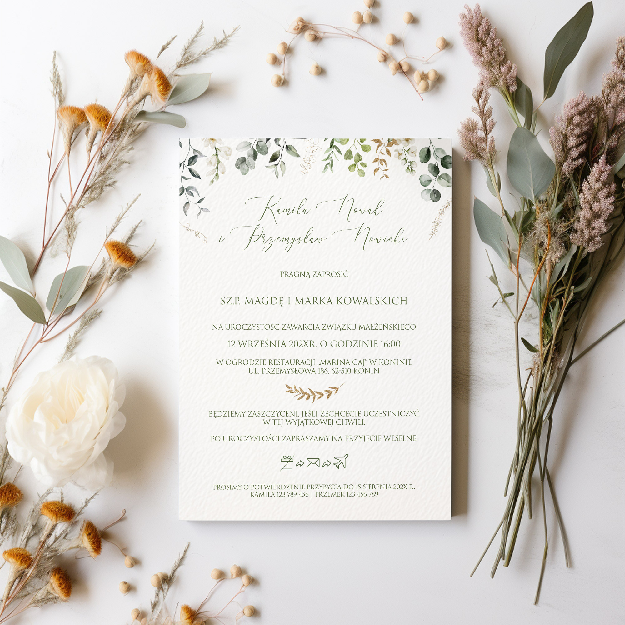 Zaproszenia ślubne z eukaliptusem - jednokartkowe 10x15