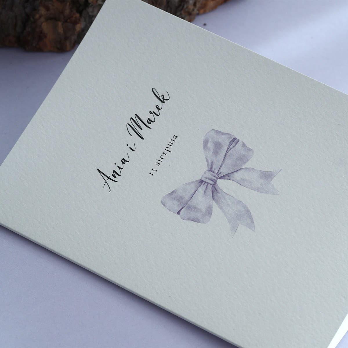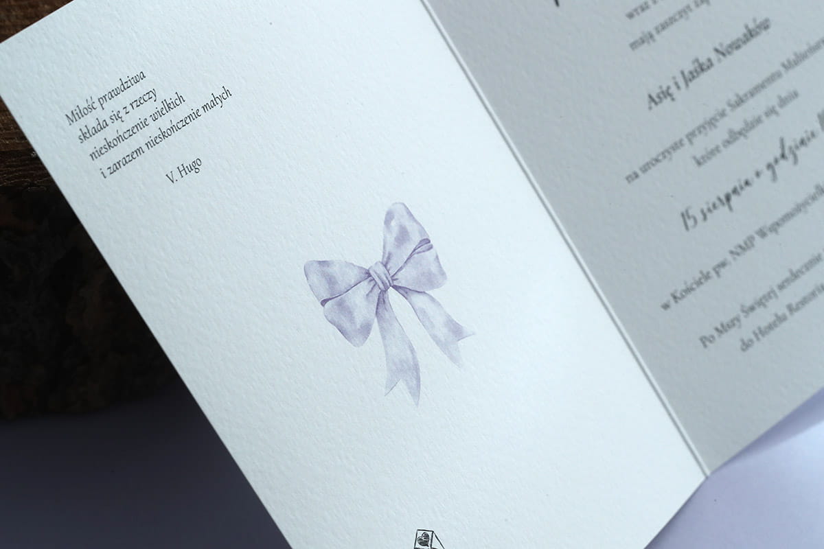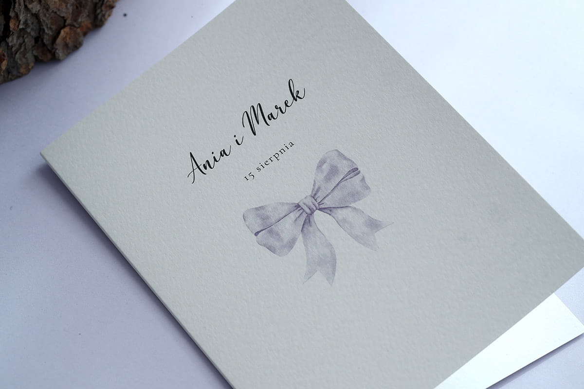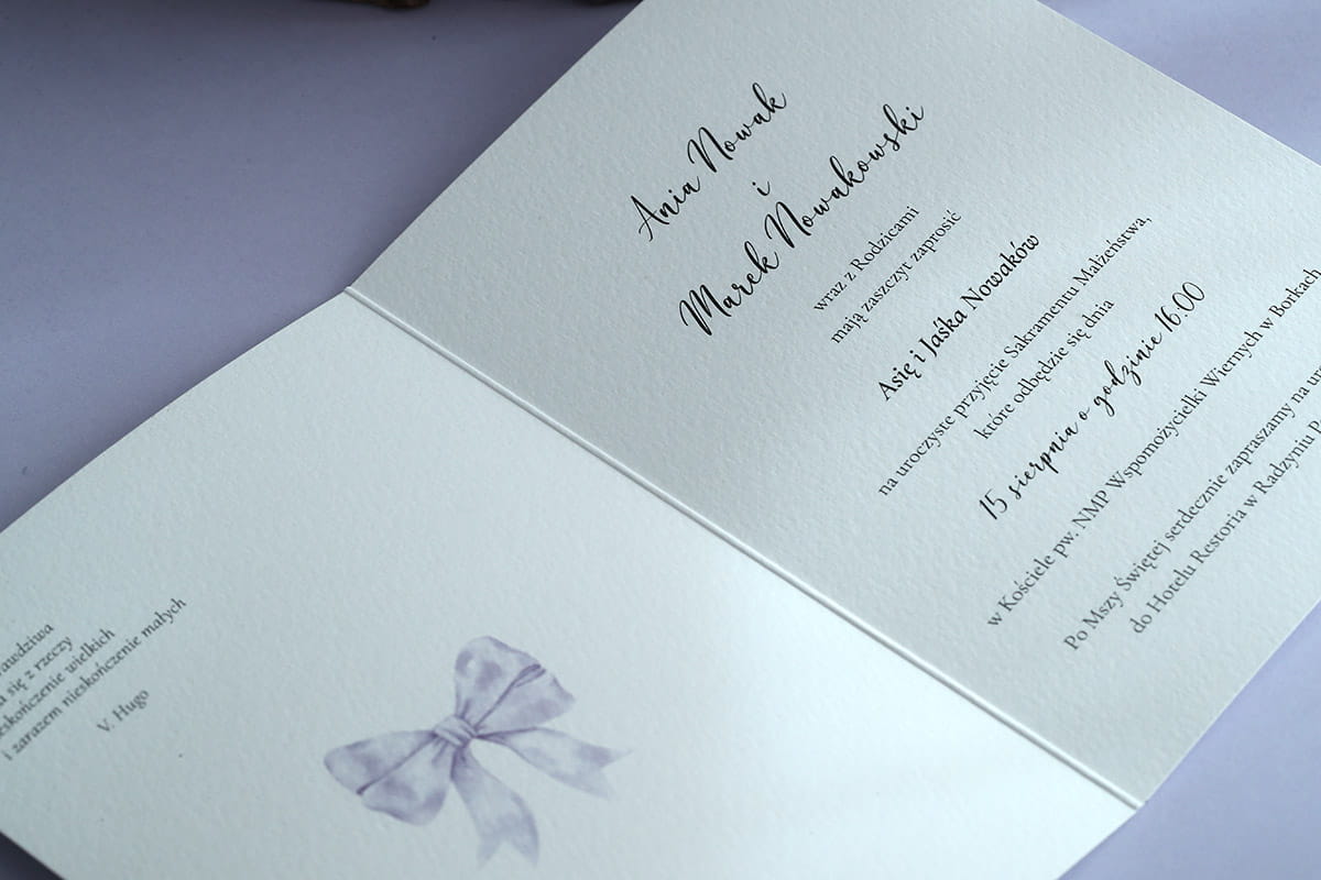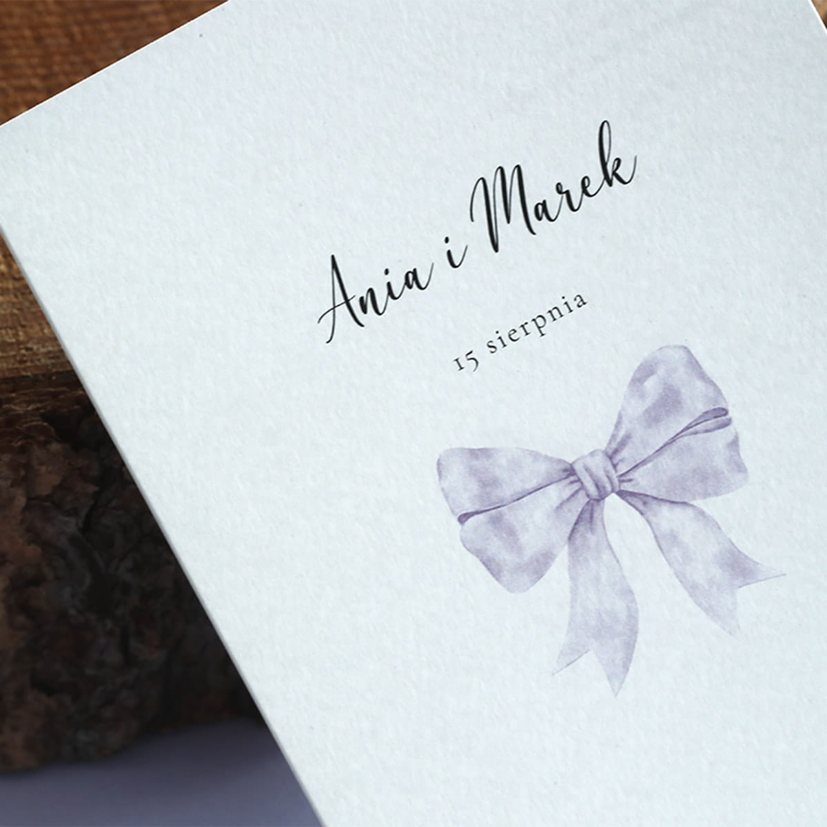Zaproszenia o delikatnym wyglądzie z motywem liliowej, uroczej wstążki.
