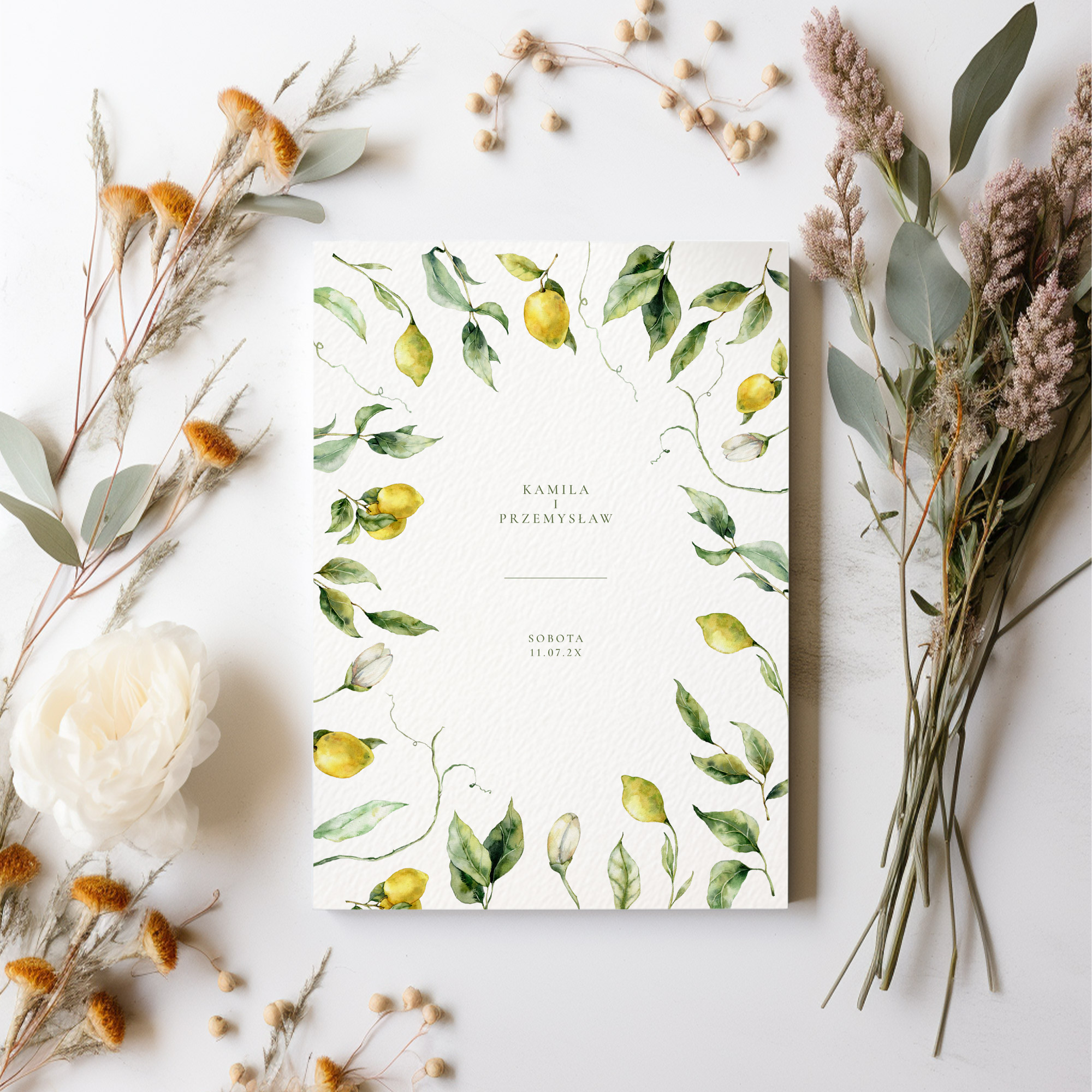 Centralnym punktem są ręcznie malowane, akwarelowe owoce cytryn i delikatne listki, które tworzą naturalną, botaniczną ramę dla Waszych imion.
