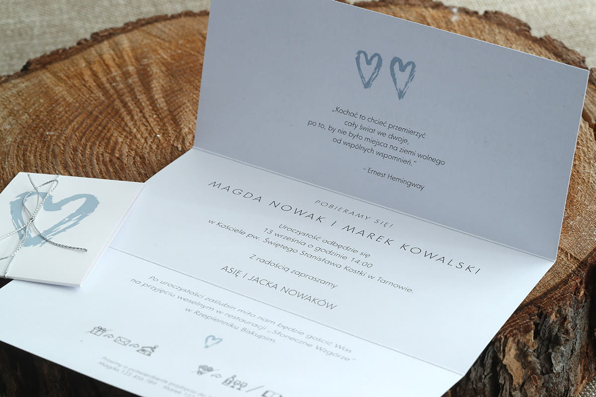 Dołącz do zamówienia treść zaproszenia uzupełnioną o wasze dane, miejsce ślubu i przyjęcia, telefonami z imionami do potwierdzenia, oraz wybrane cytaty i rebusy.