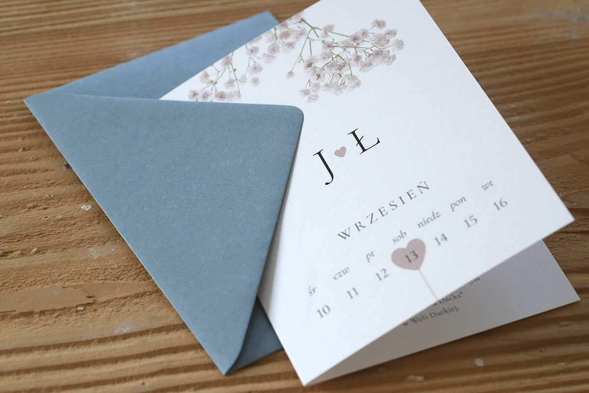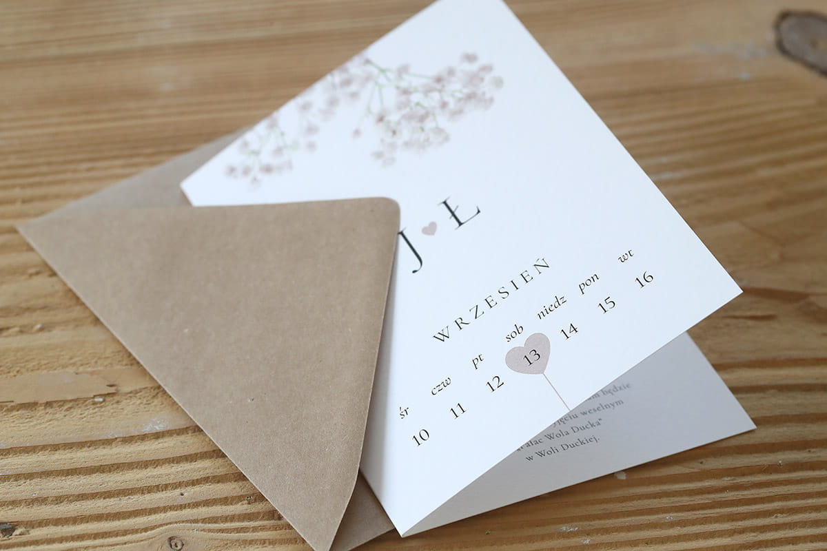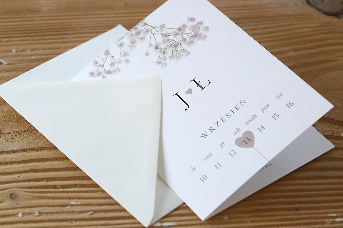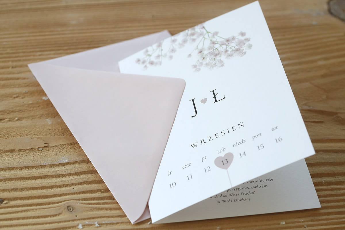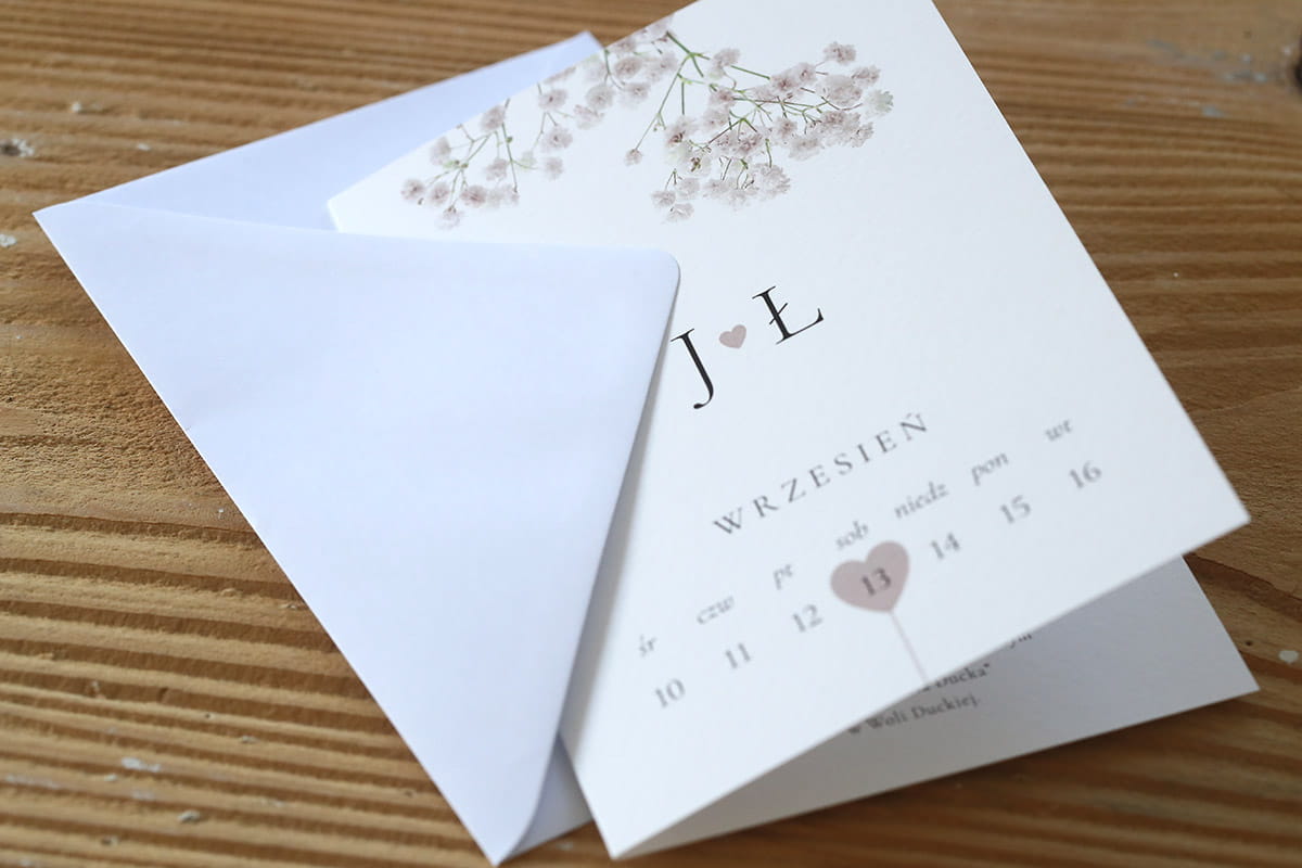 Zaproszenia ślubne z różową gipsówką i słodkim kalendarzem.