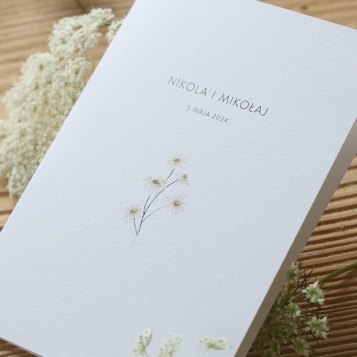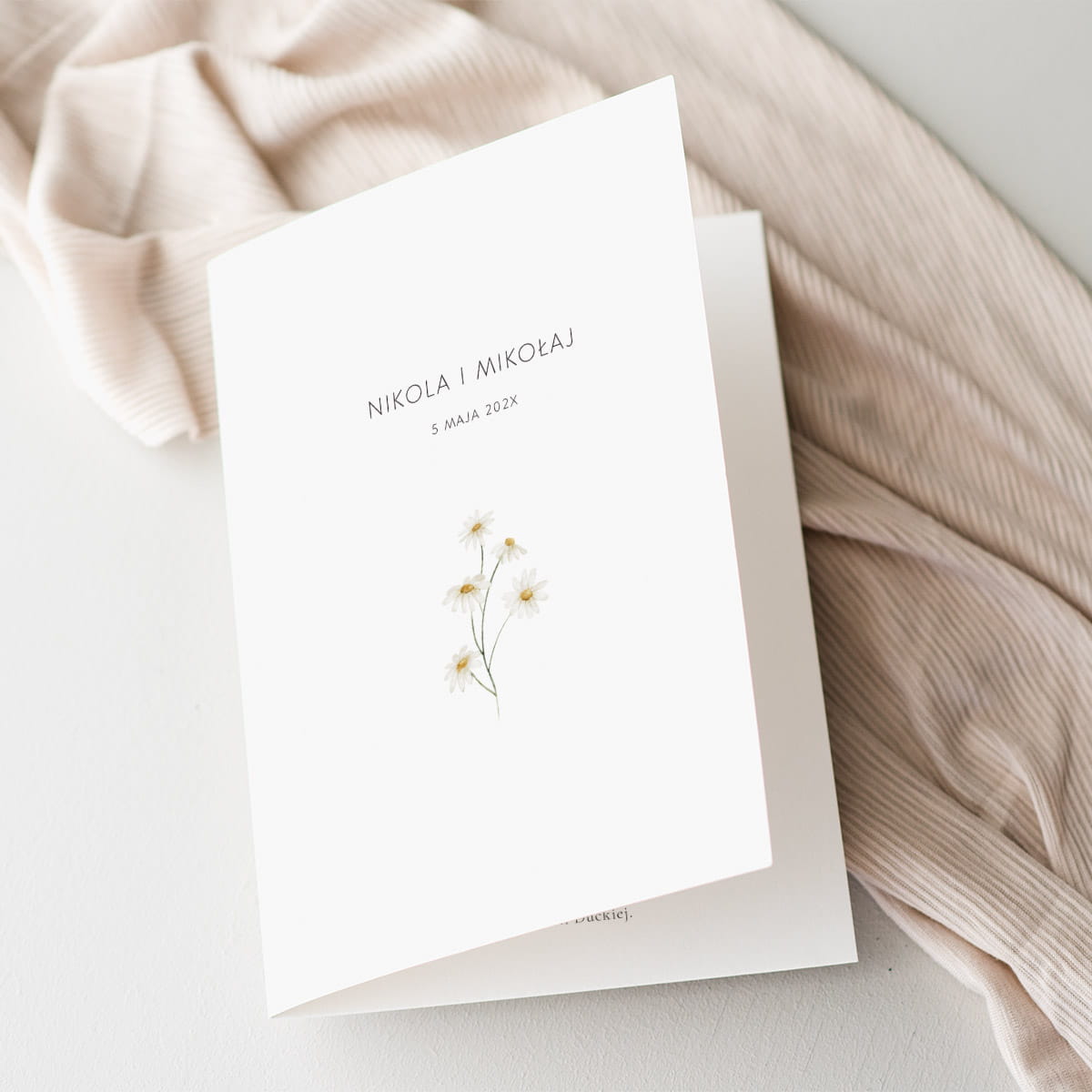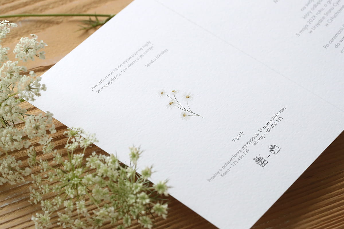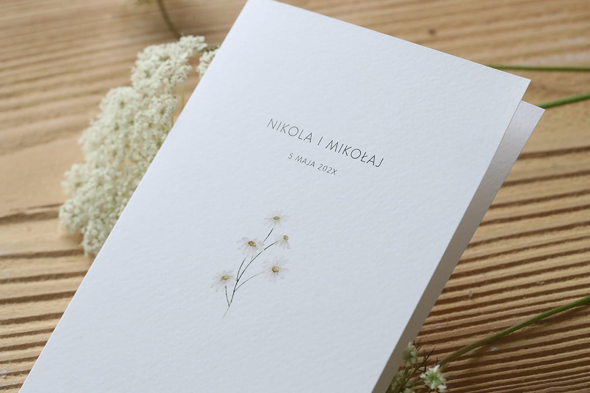 Spójrz na to urocze zaproszenie z rumiankiem – emanuje naturalnym spokojem i delikatnym urokiem w nowoczesnym stylu.