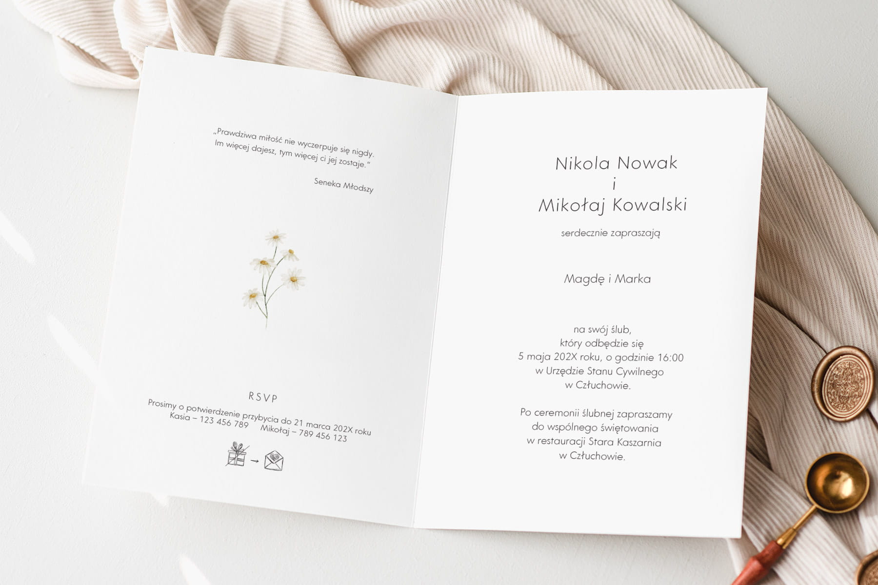 Dołącz do zamówienia treść zaproszenia uzupełnioną o wasze dane, miejsce ślubu i przyjęcia, telefonami z imionami do potwierdzenia, oraz wybrane cytaty i rebusy.