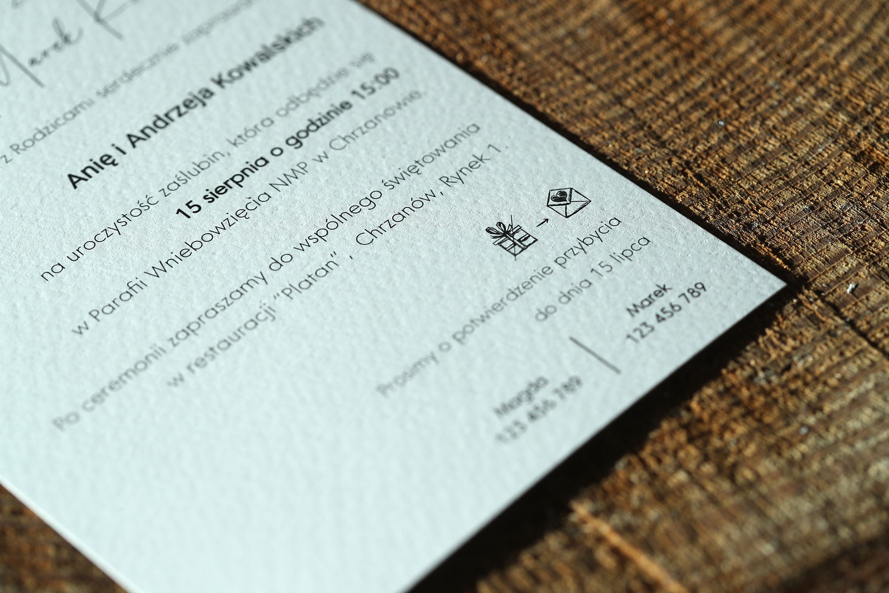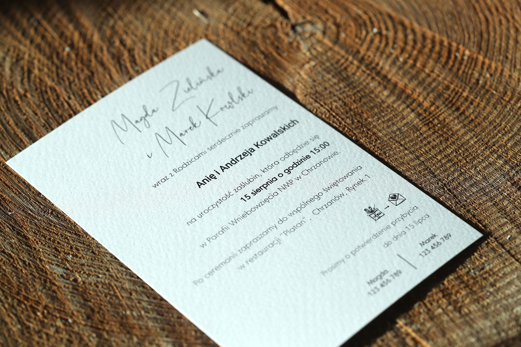 Dołącz do zamówienia treść zaproszenia uzupełnioną o wasze dane, miejsce ślubu i przyjęcia, telefonami z imionami do potwierdzenia, oraz wybrane cytaty i rebusy.