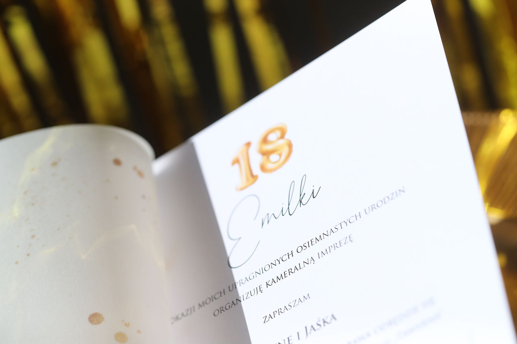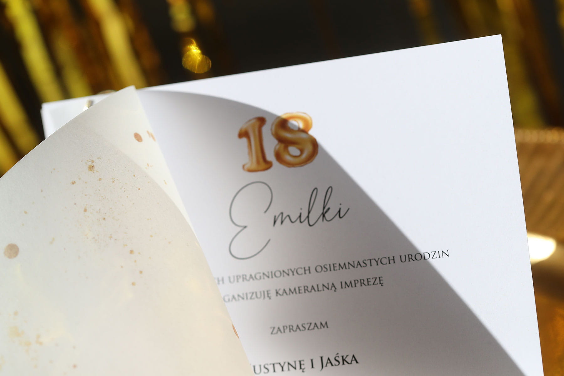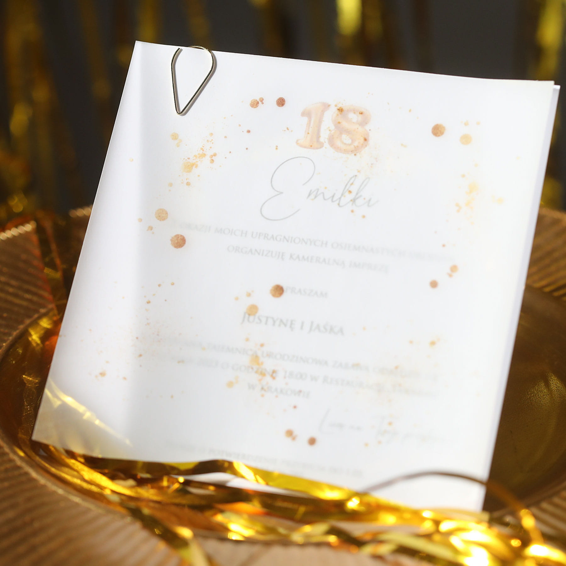 Zaproszenia ze złotym brokatem na 18 urodziny