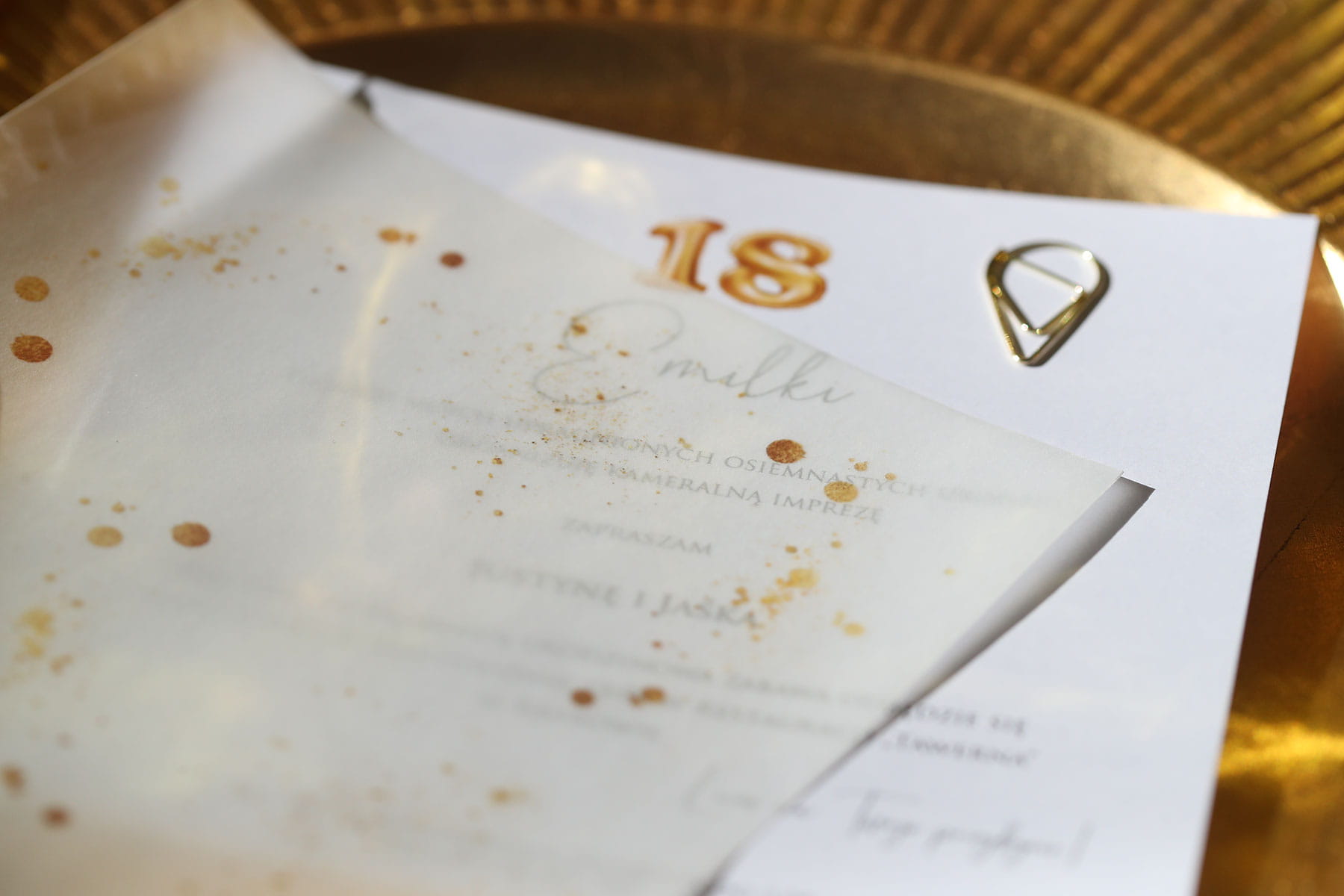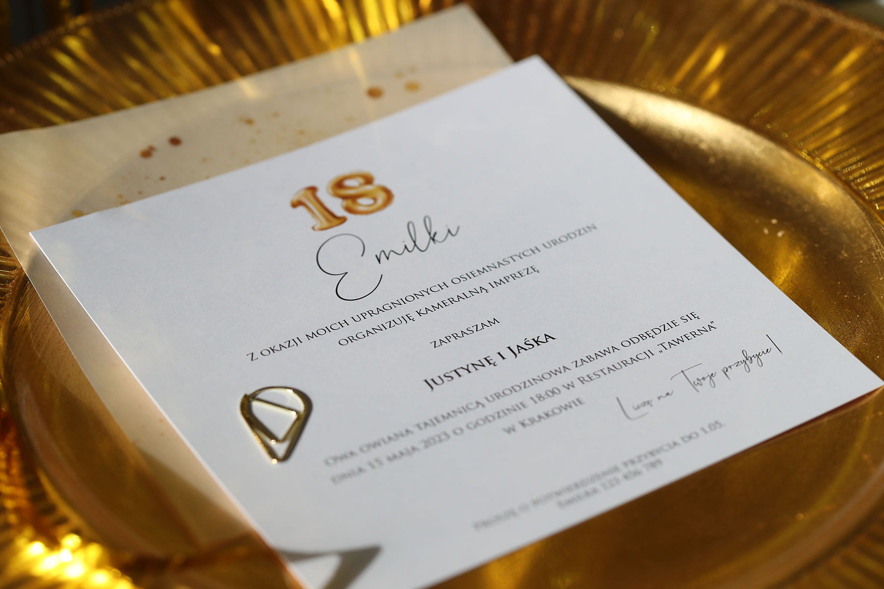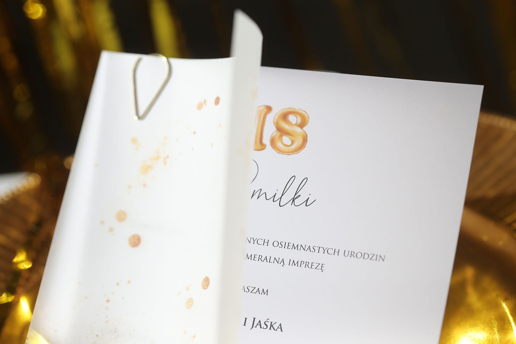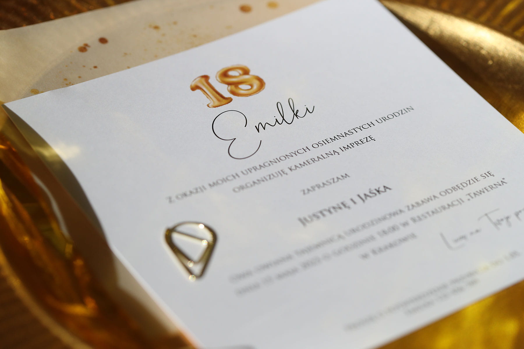 Zaproszenia ze złotym brokatem na 18 urodziny