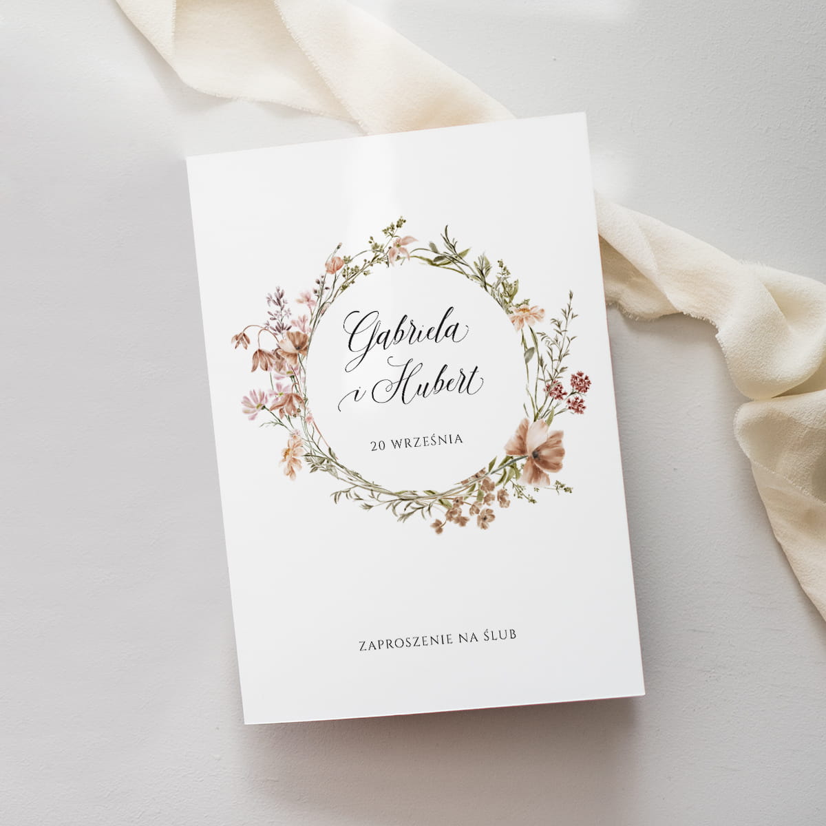 Styl zaproszenia jest romantyczny i boho, łączący kaligraficzną czcionkę z delikatnymi, akwarelowymi motywami polnych kwiatów i traw w wianku.