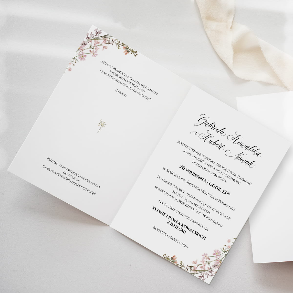 Dołącz do zamówienia treść zaproszenia uzupełnioną o wasze dane, miejsce ślubu i przyjęcia, telefonami z imionami do potwierdzenia, oraz wybrane cytaty i rebusy.