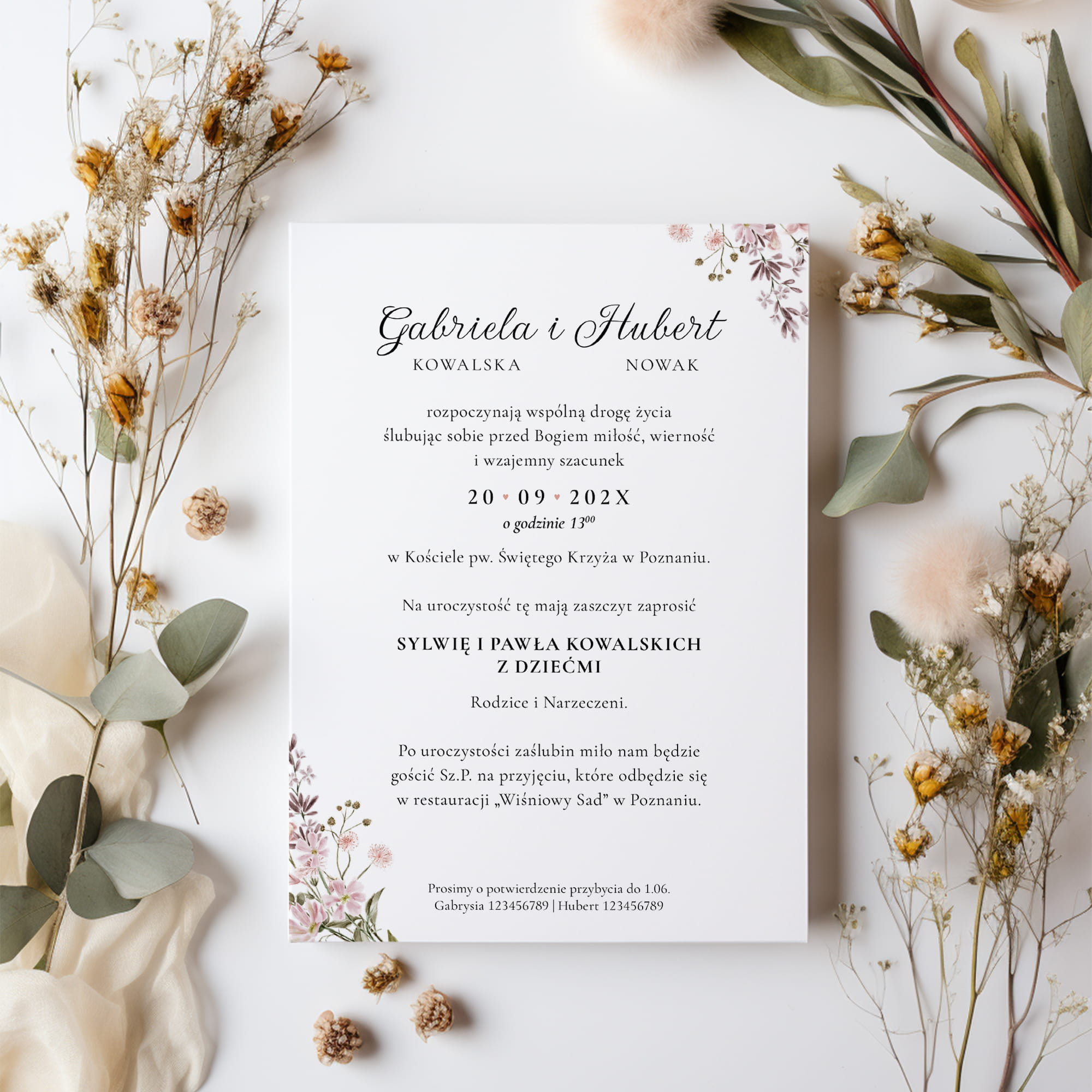 Dołącz do zamówienia treść zaproszenia uzupełnioną o wasze dane, miejsce ślubu i przyjęcia, telefonami z imionami do potwierdzenia, oraz wybrane cytaty i rebusy.