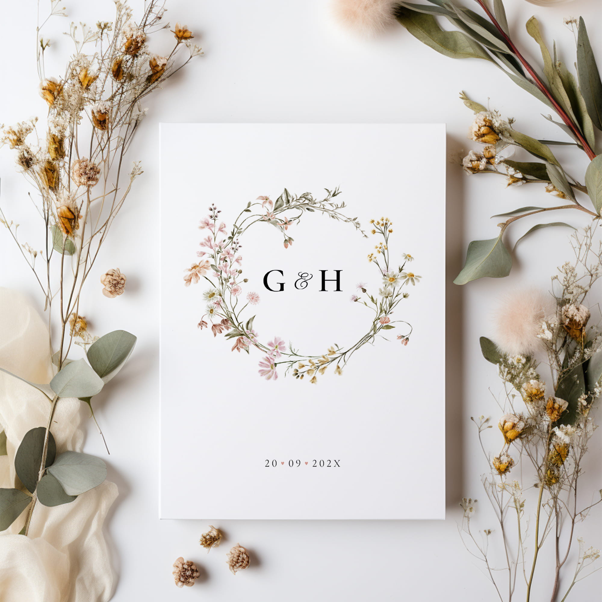 Zaproszenie w stylu botanicznym i romantycznym, którego głównym elementem jest delikatny, akwarelowy wianek z polnych i leśnych kwiatów otaczający inicjały pary młodej.